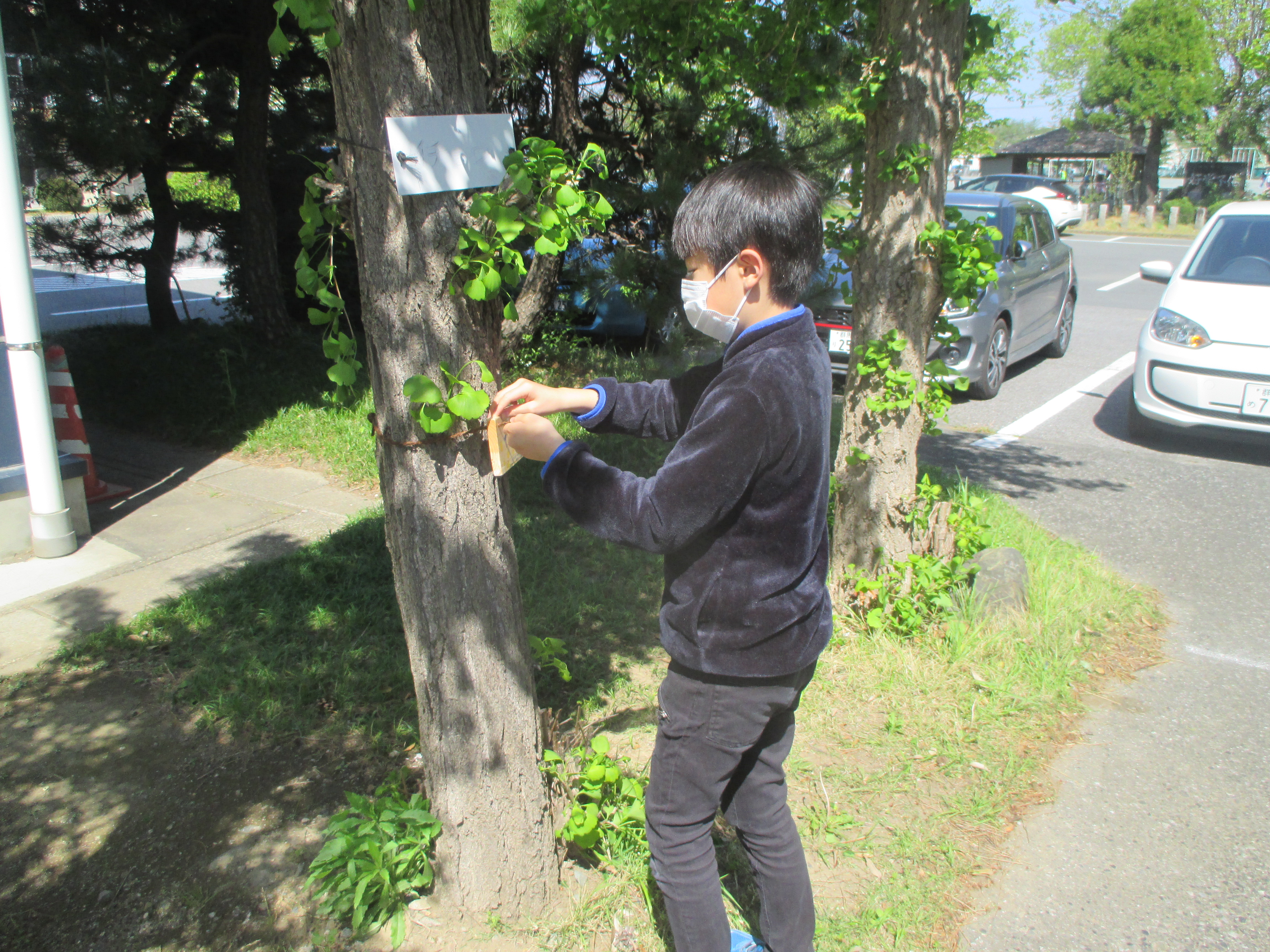 4月の委員会活動でプレートを作成して、樹木に設置を行い、7月の総合的な学習の時間で『九合小学校の木のしおり』を使用し、校内の樹木マップを作成しました。「児童が意欲をもって活動に取り組み、楽しく活動することができました」との感想をいただきました。