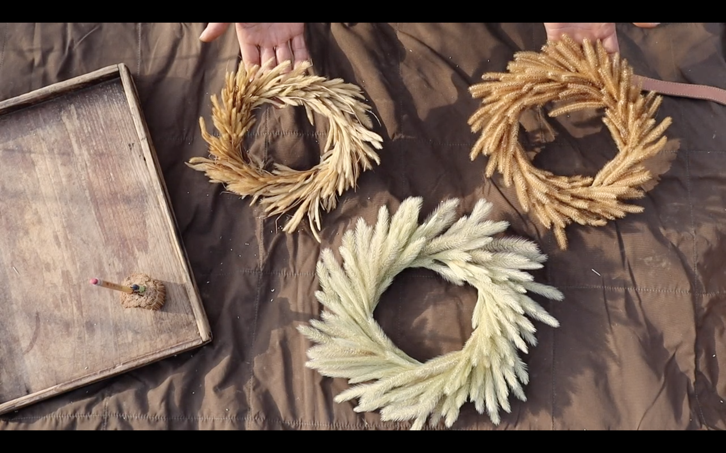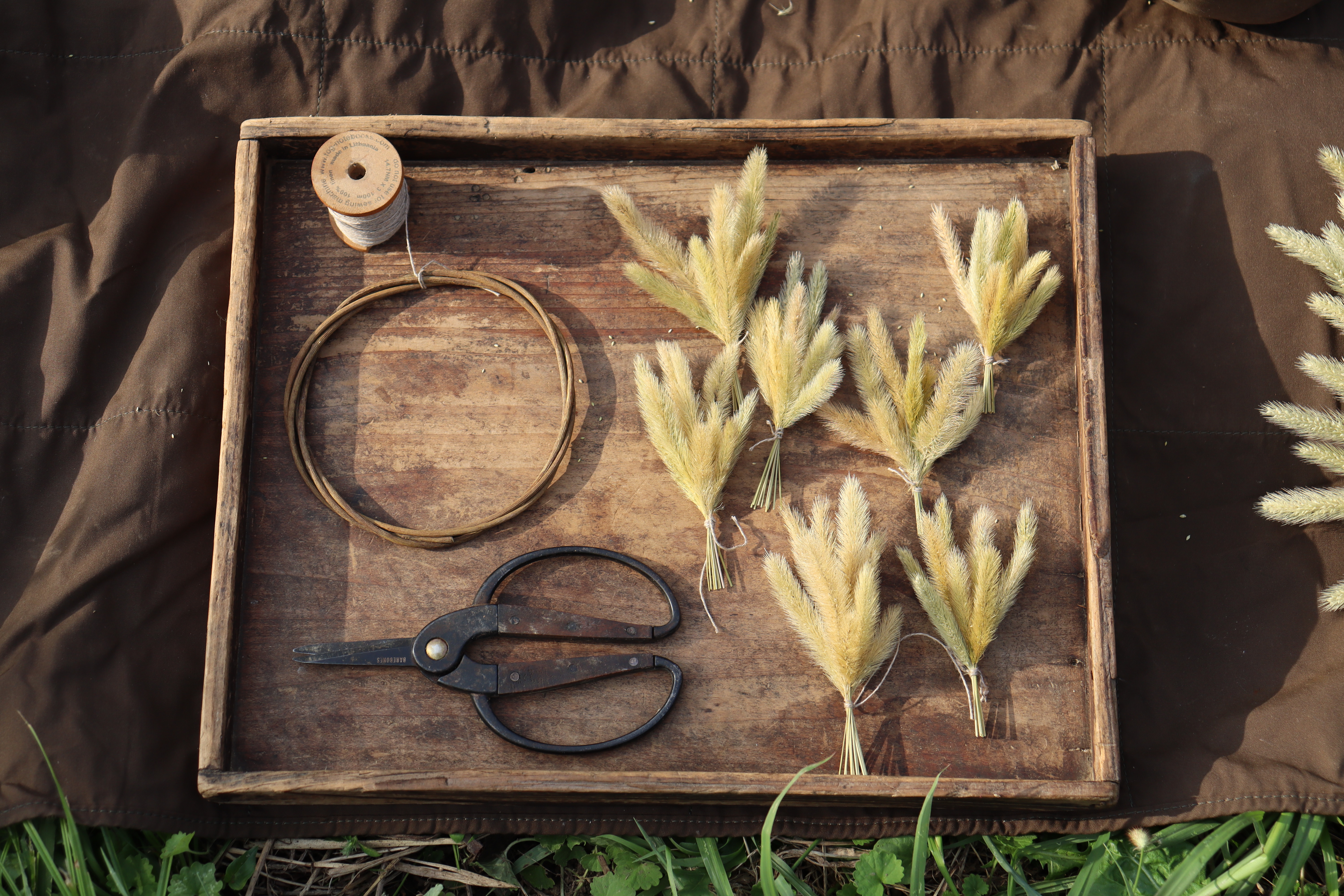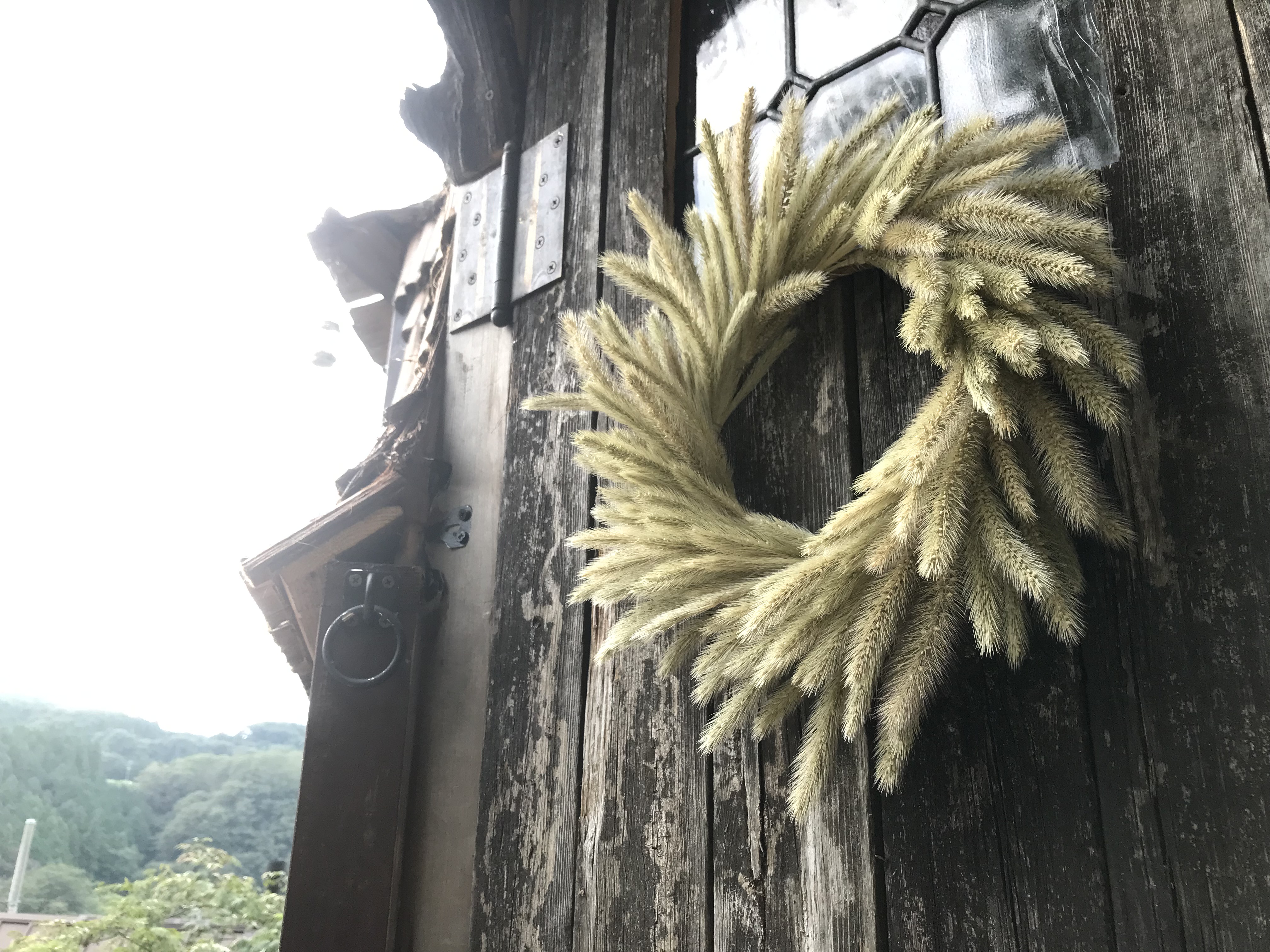 毛を伸ばしタワワに種を付けたエノコログサはイネの仲間で五穀のアワなどとも同じ種類。それが裏山の斜面や前の空き地一面を埋め尽くします。食べる訳ではないですがエノコログサをたくさん摘んでリースを作り、この先の年の豊作を祈願するような気持ちで飾っています。そしてリース作りで残ったエノコログサの茎の軸を米俵をイメージした鉛筆立てに仕立てます。