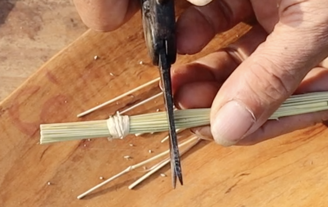 軸は6mm径くらいを約4cm長の間隔でラフィアで結び、1結びを中心に同じ長さで切る