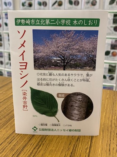 樹木名プレートは卒業記念として6年生からの在校生へのプレゼントとして作成していただきました。「伊勢崎市立北第二小学校の木のしおり」は全校児童に配布し、低学年は生活の授業で活用し、他の学年の子どもたちは休み時間等で自然観察会を実施していただきました。