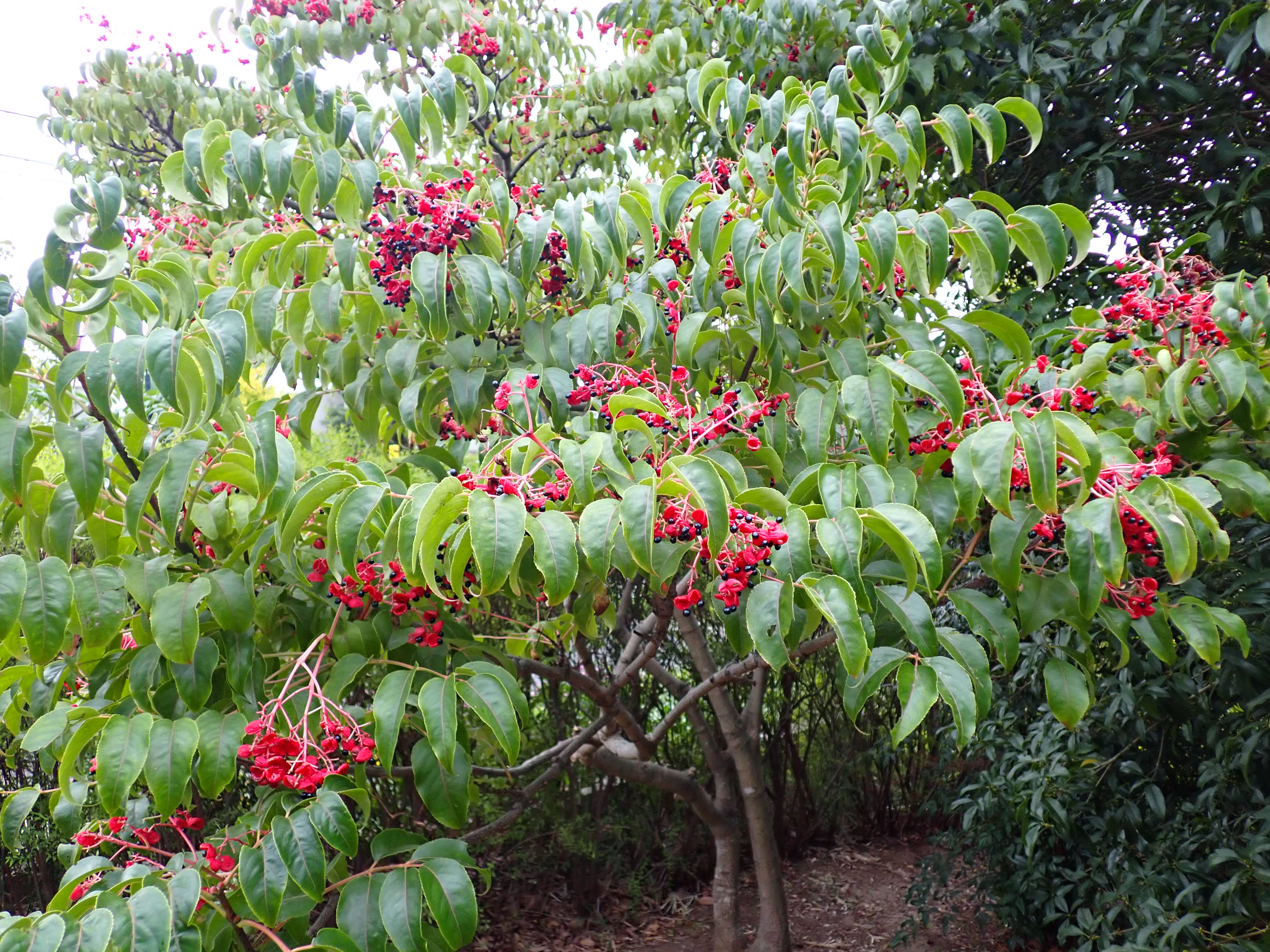 日当たりの良いやや乾燥した林縁に多く見られる落葉小高木です。あまり目立つ木ではなく地味な存在ですが、9月~10月に真っ赤な果皮の中から黒い光沢のある種が顔を出し、とても目立ちます。。樹皮には縦に不規則な白い模様があります。名前は魚の「ゴンズイ」に由来するそうです。