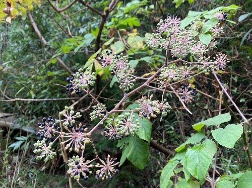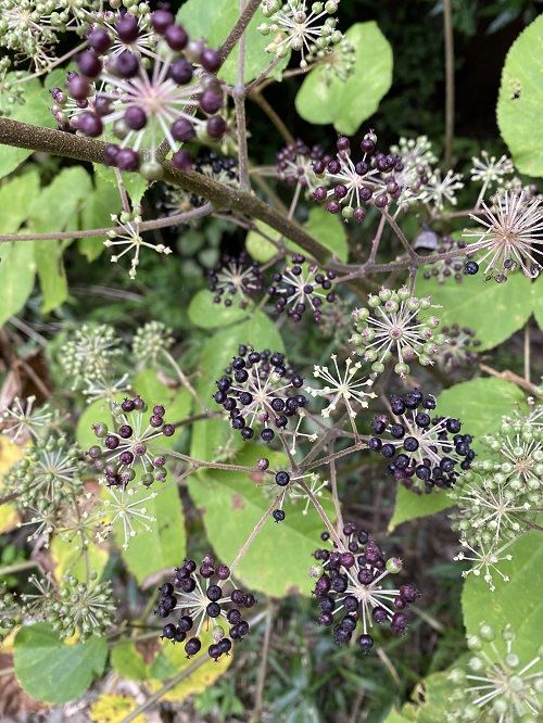 夏に花をつけ、10月~11月に黒く熟す実をつけます。実が熟すにつれ、実のついている柄(花柄)が若紫色になるので、実の周りが赤っぽく見えるようになります。実を食べにくる鳥を引きつける工夫かもしれませんね。幹や枝に鋭いとげがありますが、このとげが少なかったり、ないものもありメダラやとげなしタラノキと呼ばれています。