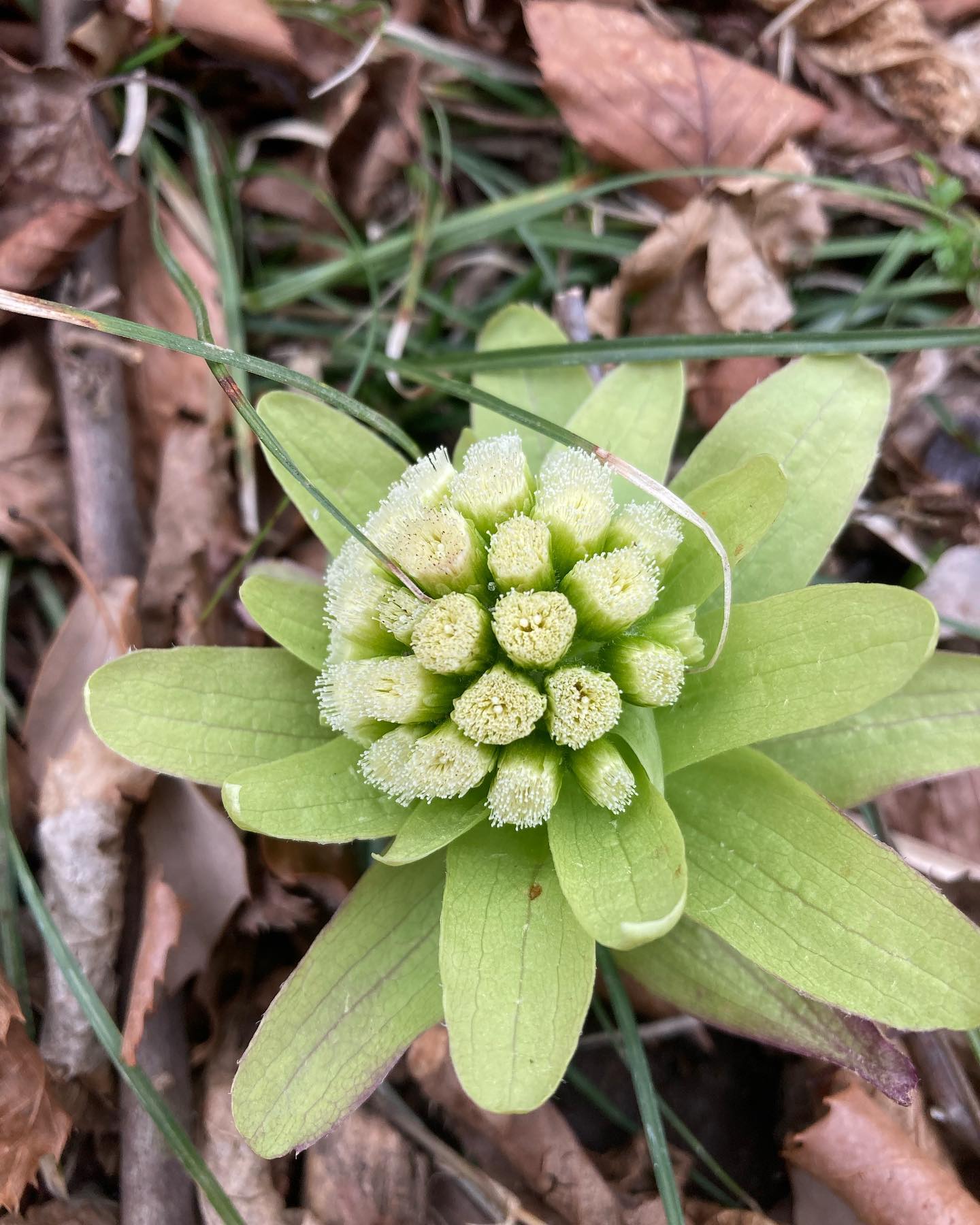 そんなフキですが花にはオスとメスがあることをご存知ですか?オスは黄色い小花が隙間なく並んで球体になっています(写真2枚目)。対するメスは細かい毛のような雌しべが密集しており、小花の間には隙間があります(写真3枚目)