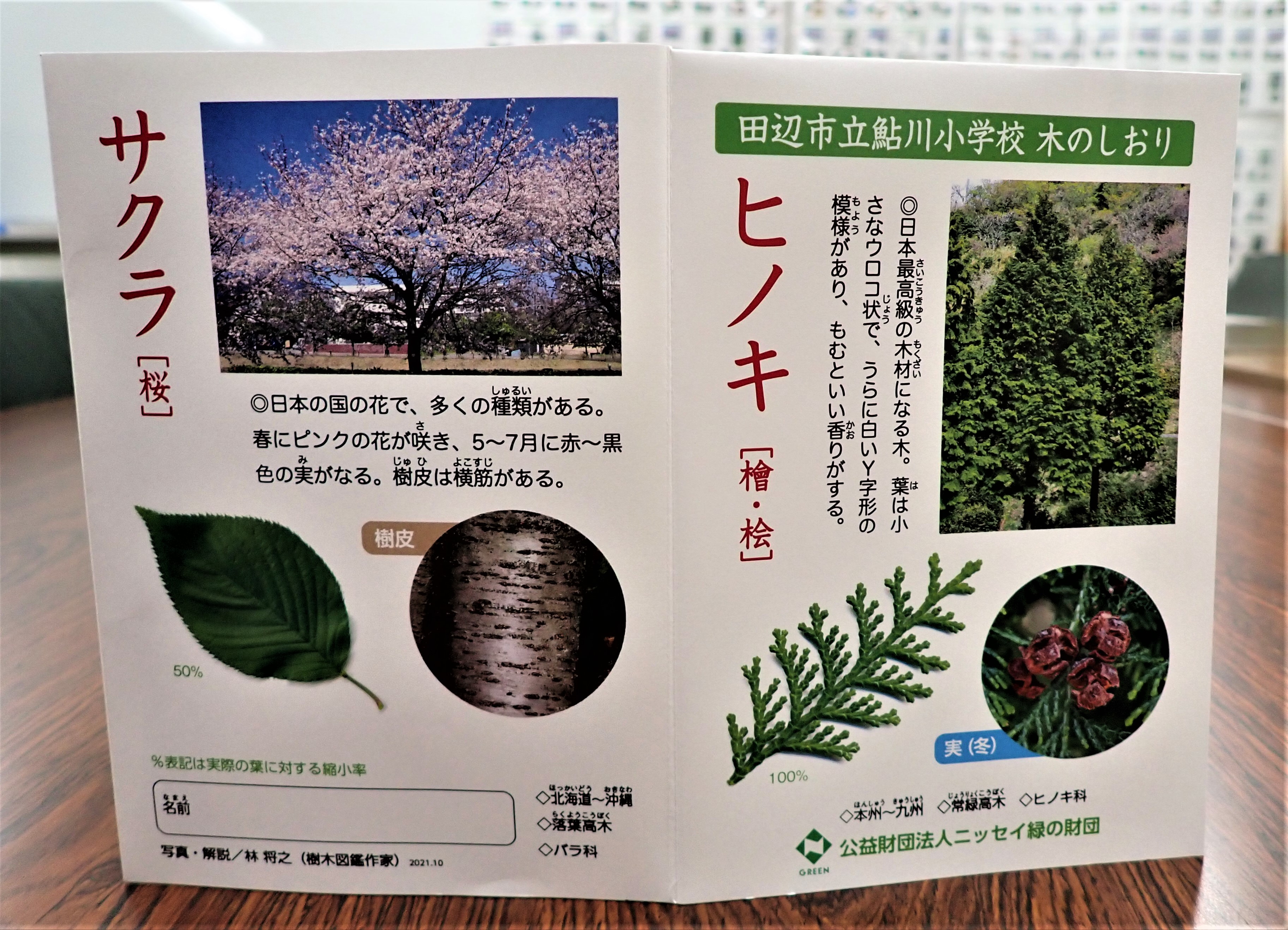 《和歌山県 田辺市立鮎川小学校にて、「学校の木のしおり」と樹木名プレート(樹名板)の作成・設置により校内の自然観察を行っていただきました》