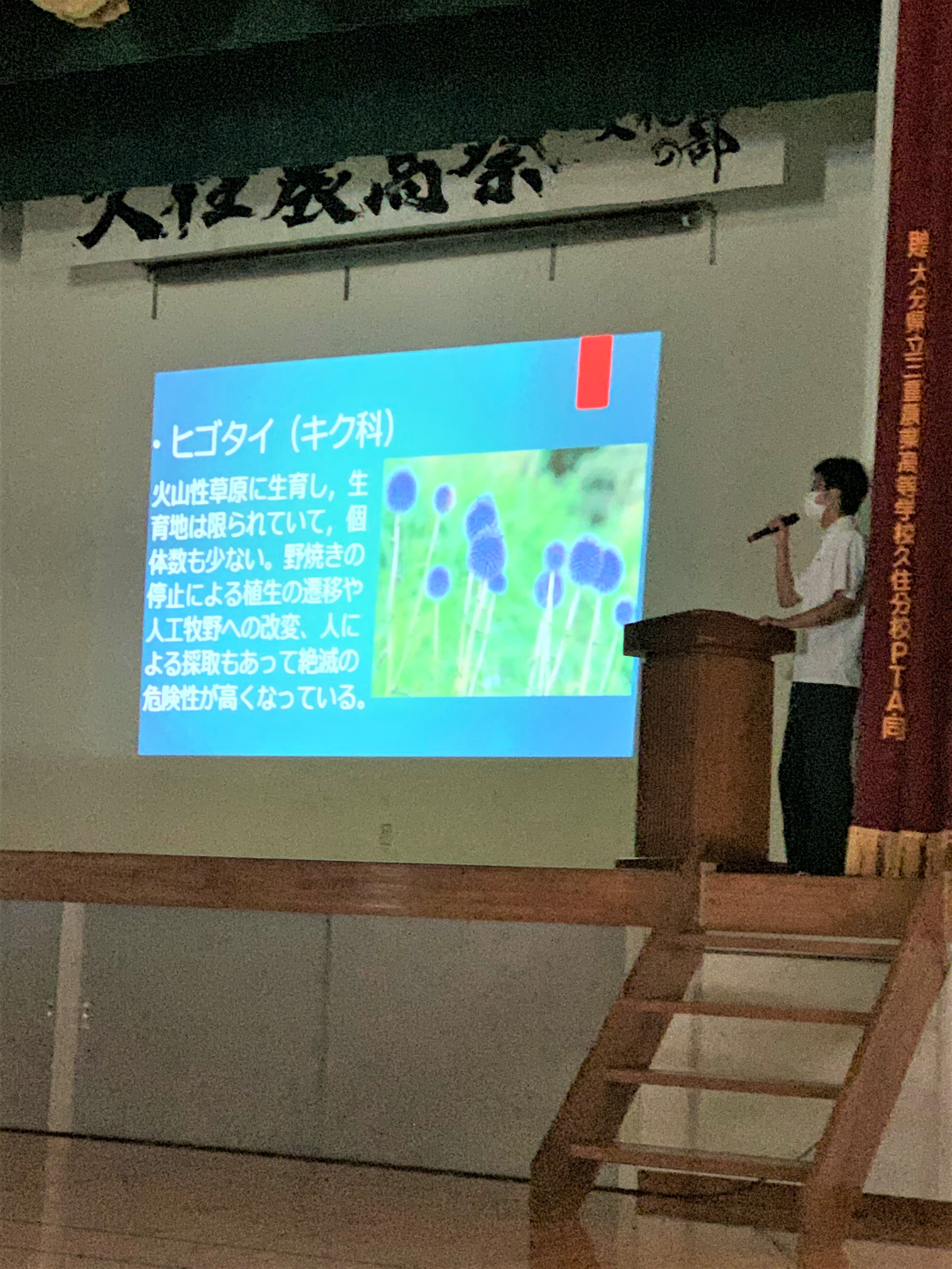 自然科学部の生徒と有志が中心となって、学校の木のしおりと樹木名プレートを作成していただきました。 その後、文化祭の有志発表の場面で、学校のある久住地域の自然の特徴や希少植物の紹介、校庭の樹木の紹介を行いました。併せて、しおり配布と、樹木名プレートの紹介を行いました。その後、全校生徒にアンケート調査を行い、自然への関心が高まったか調査を行っていただきました。