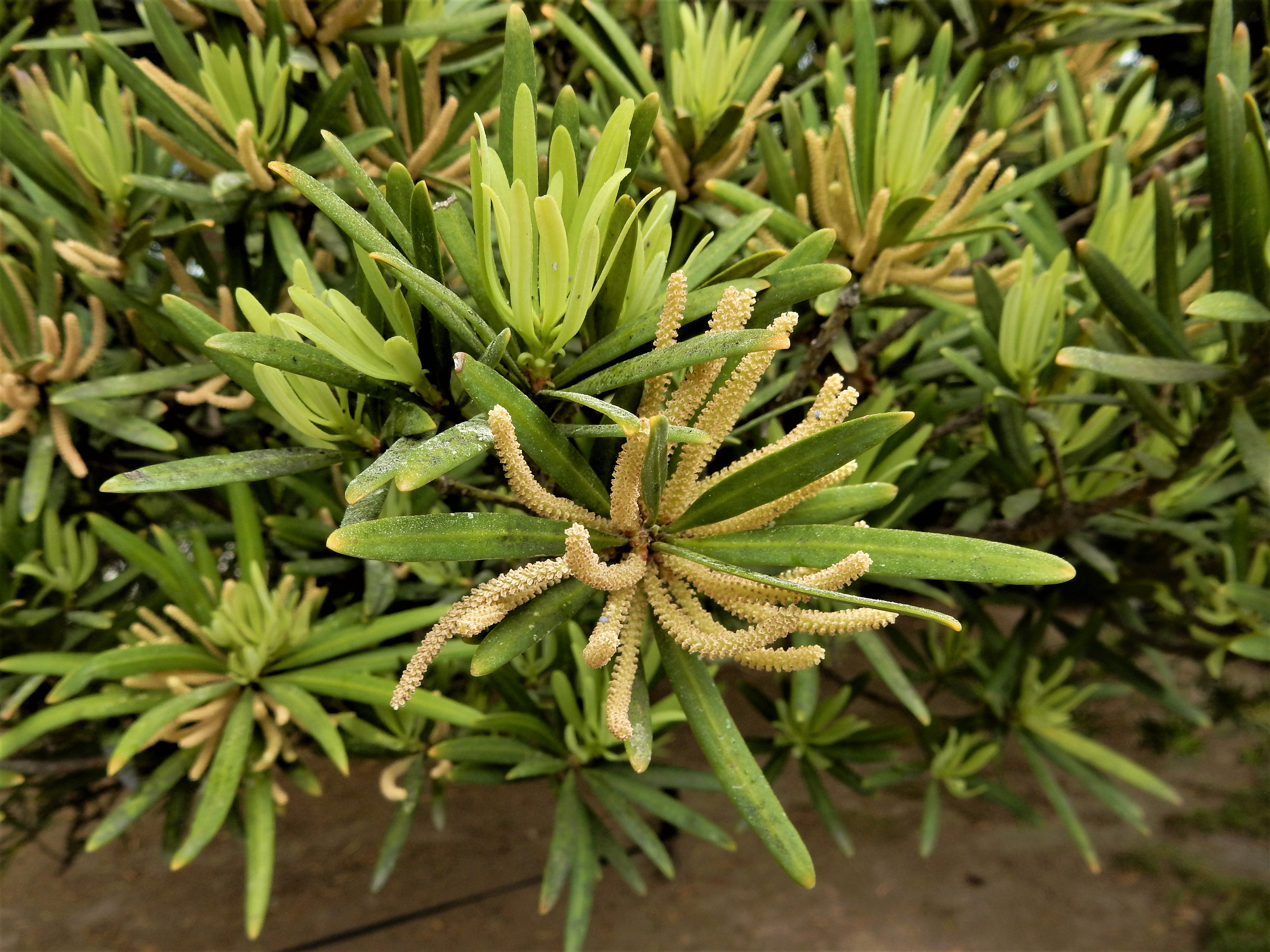 葉の幅は広いのですが、針葉樹(裸子植物)で、雌雄異株です。白い雄花は目立ちます。
