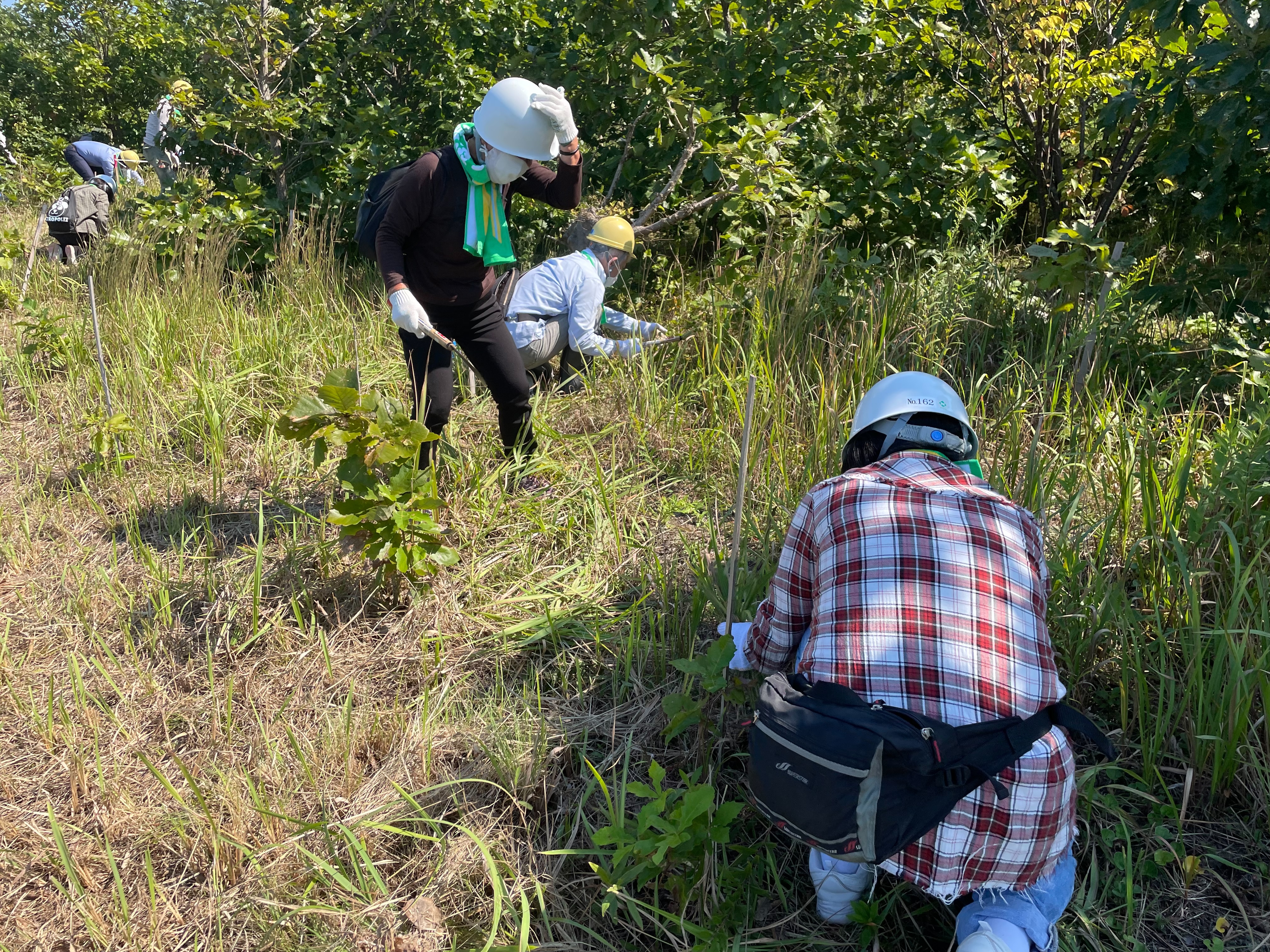作業内容は、2019年に防風林の機能を更に高めるためにカシワをボランティアで補植しましたが、その補植した木が順調に生育していくための下草刈りと幼木に巻き付いているつるを取り除く作業(つる切)を行いました。