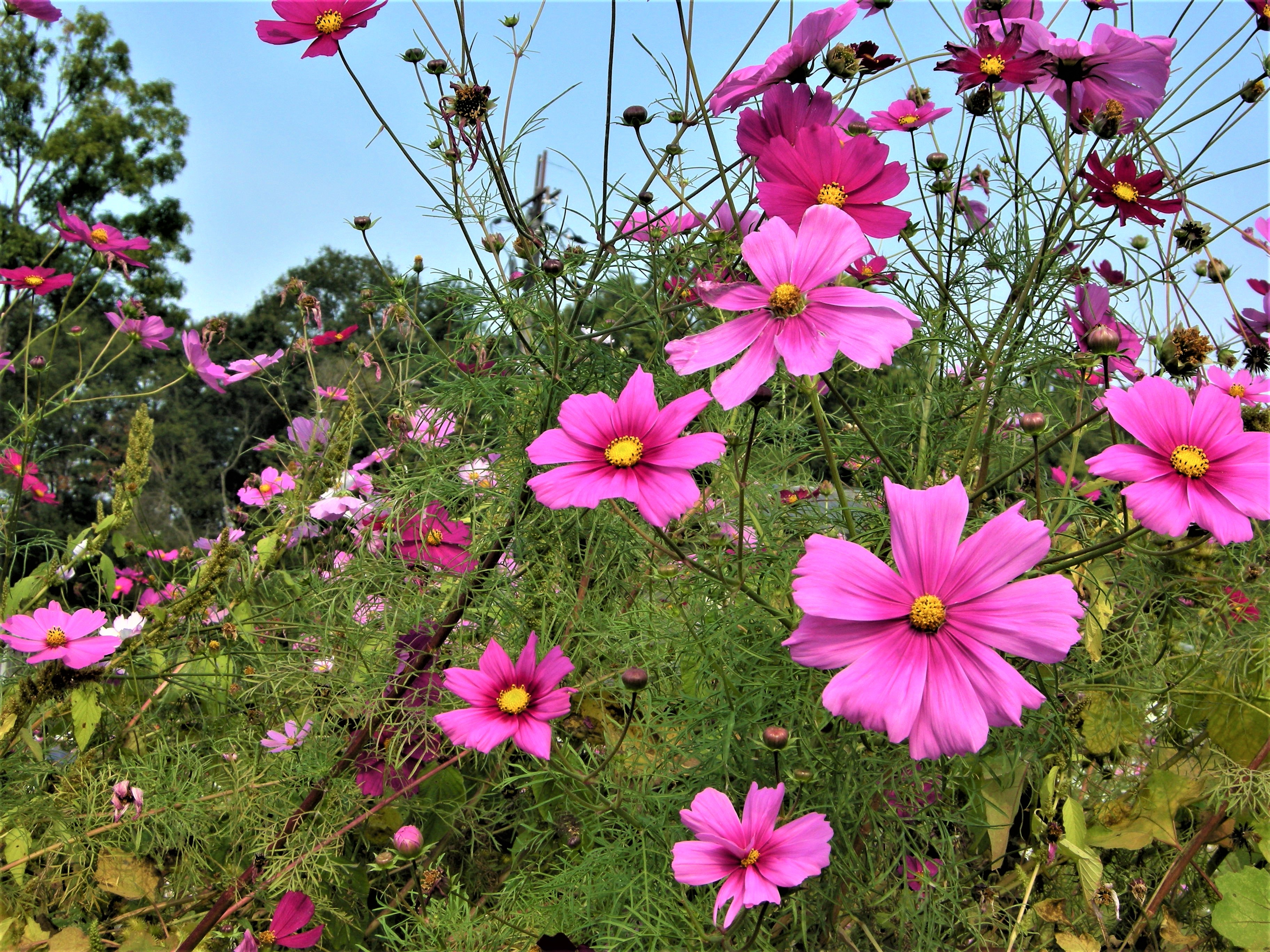 原産地はメキシコの標高1600m以上の高地です。原産地ではピンクで稀に白花があるようです。明治の初めころ渡来しました。コスモスは美しいという意味のギリシャ語“kosmos”に由来します。日本名はアキザクラ(秋桜)ですが、コスモスという方が一般的になっています。性質はいたって丈夫で、日当たりと風通しがよい場所であれば、あまり土質を選ばずに育ち、明治末には日本全土に広まっていたようです。作り出された品種が多く、様々な色が見られます。