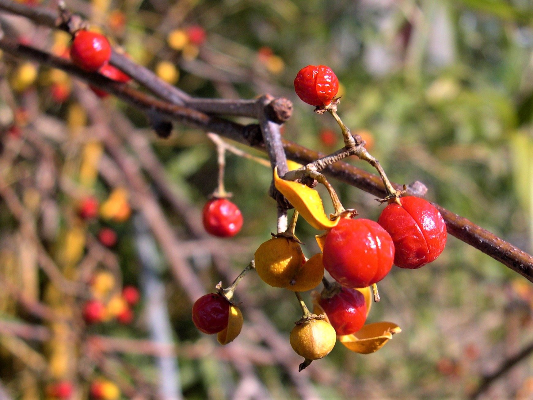 植物の名前は、時に連想ゲームのように感じられることがあります。葉がウメ(梅)に似ていることからウメモドキ(梅擬)、葉と果実がウメモドキに似ていてつる性なのでツルウメモドキ(蔓梅擬)となりました。いずれも、分類的には全く関係のない植物です。