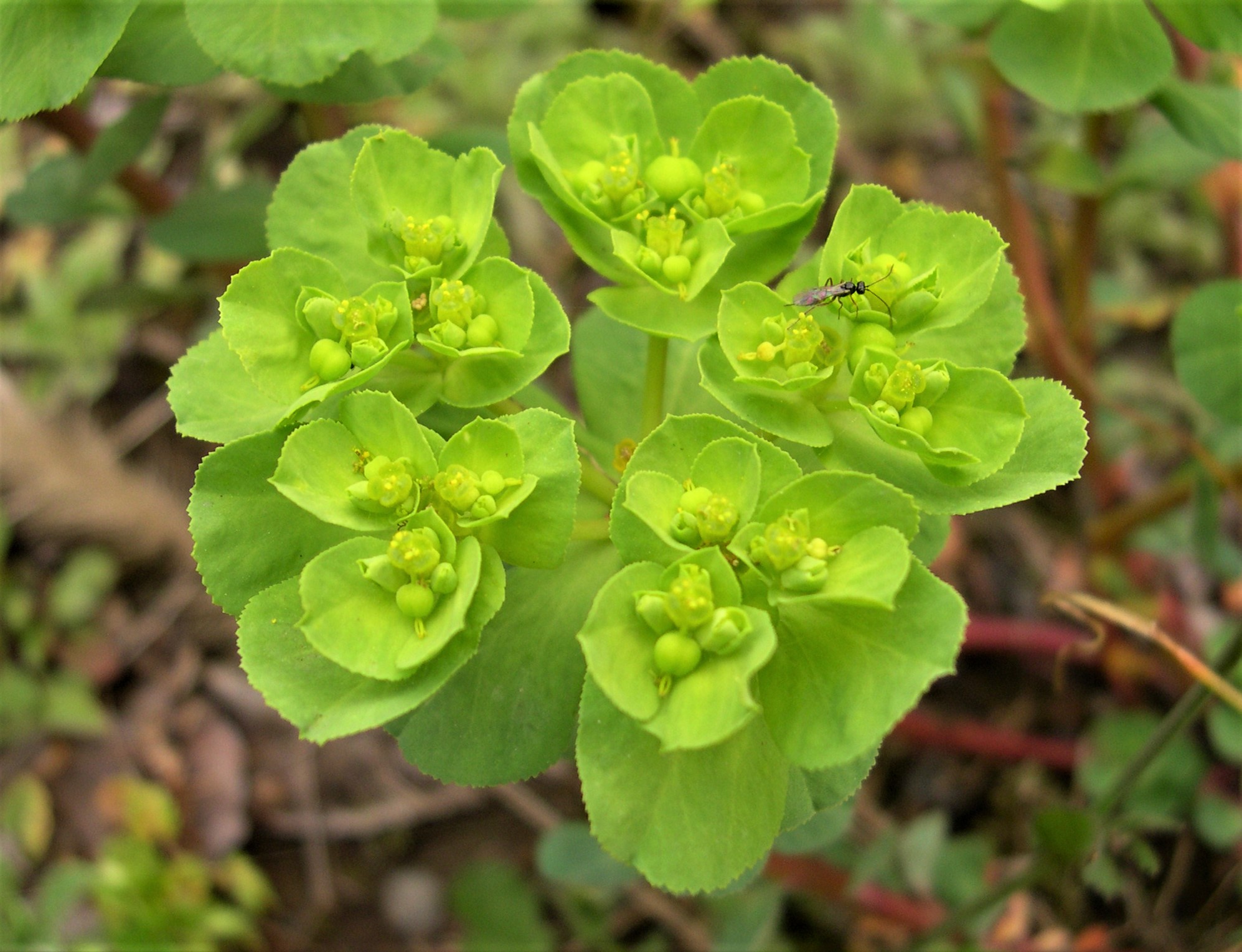 夏に花を咲かせますが、小さな黄色の花で、咲いていることに気づくこともないくらい目立ちません。秋に見られる小さな果実はいぼ状の突起があります。全草有毒ですので、注意が必要です。特に、植物体を傷つけた時に出る乳液は、触れるとかぶれる方があります。