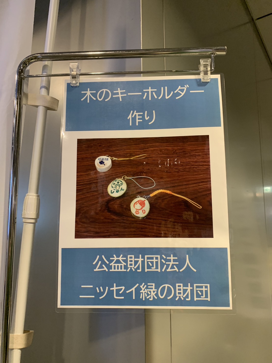 今回は、“ニッセイの森”の間伐材を加工した「木のキーホルダー作り」をおこなっています。参加費無料のため、どなたでもご参加いただくことができます。