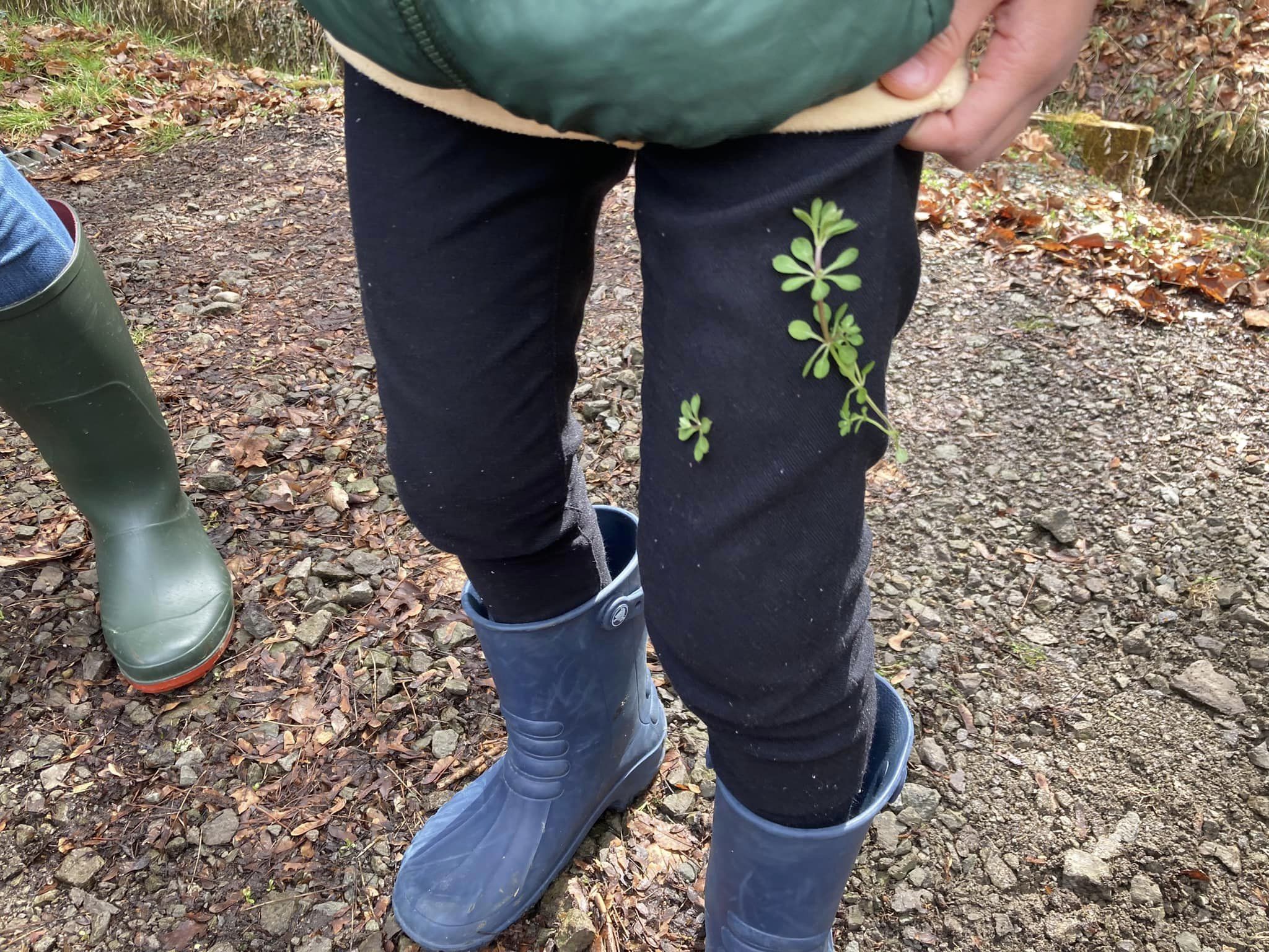 ヤエムグラを発見。ヤエムグラの茎には細かい棘があり、他の植物に寄りかかり、この棘を引っかけて立ち上がります。子ども達は見つけたヤエムグラをこっそり他の人の服にくっつけて遊んだりします。