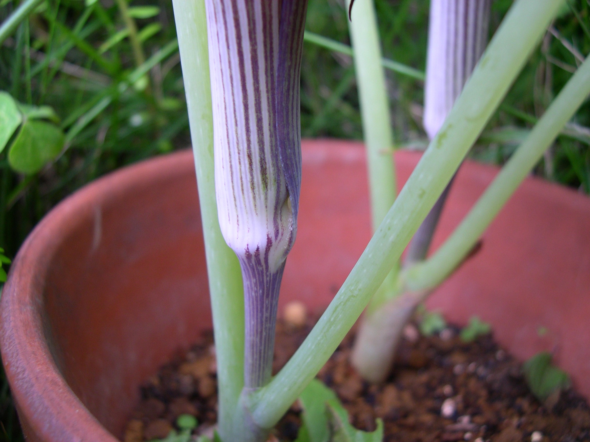 春の野山で見られるマムシグサやウラシマソウなどと同じ仲間です。関西に多く生育している植物ですが、近年、園芸店で売られているのを見かけます。