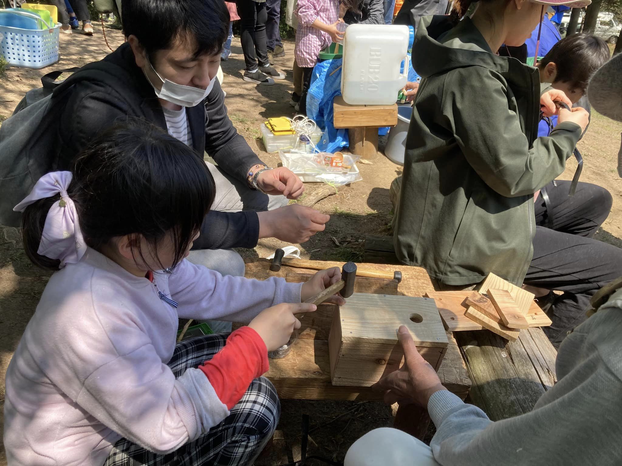 午後からは、はネイチャークラフトや巣箱づくりなどの活動を行いました。ネイチャークラフトでは枝剣が大人気。完成してすぐにスタッフとチャンバラ対決に没頭していました。鳥の巣箱づくりでは、時間をかけて丁寧に巣箱をつくるご家族の姿が印象的でした。またオタマジャクシすくいも人気で、子ども達は逃げ回るオタマジャクシを捕まえようと小さなお玉で頑張って掬っていました。捕まえたオタマジャクシは自宅で育てるとのことです。
