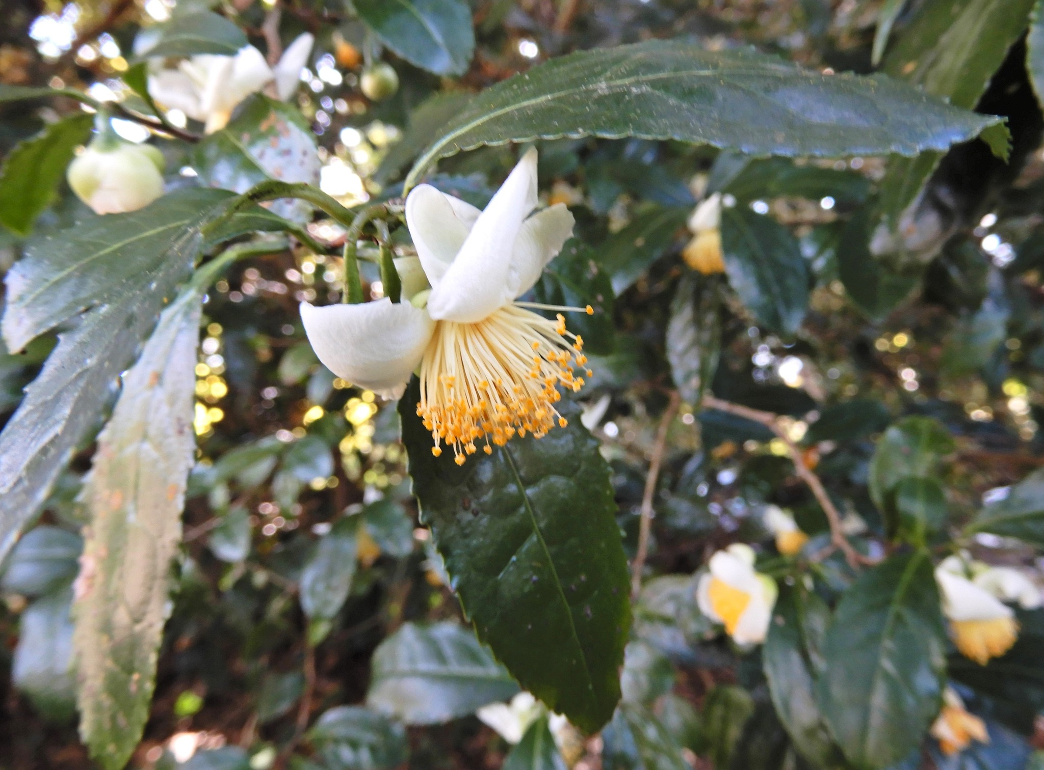 チャノキは古い時代に中国から持ち込まれた栽培植物とされています。伊豆半島や九州の一部で野生化の報告もあるようですが、逸出したものと考えられています。