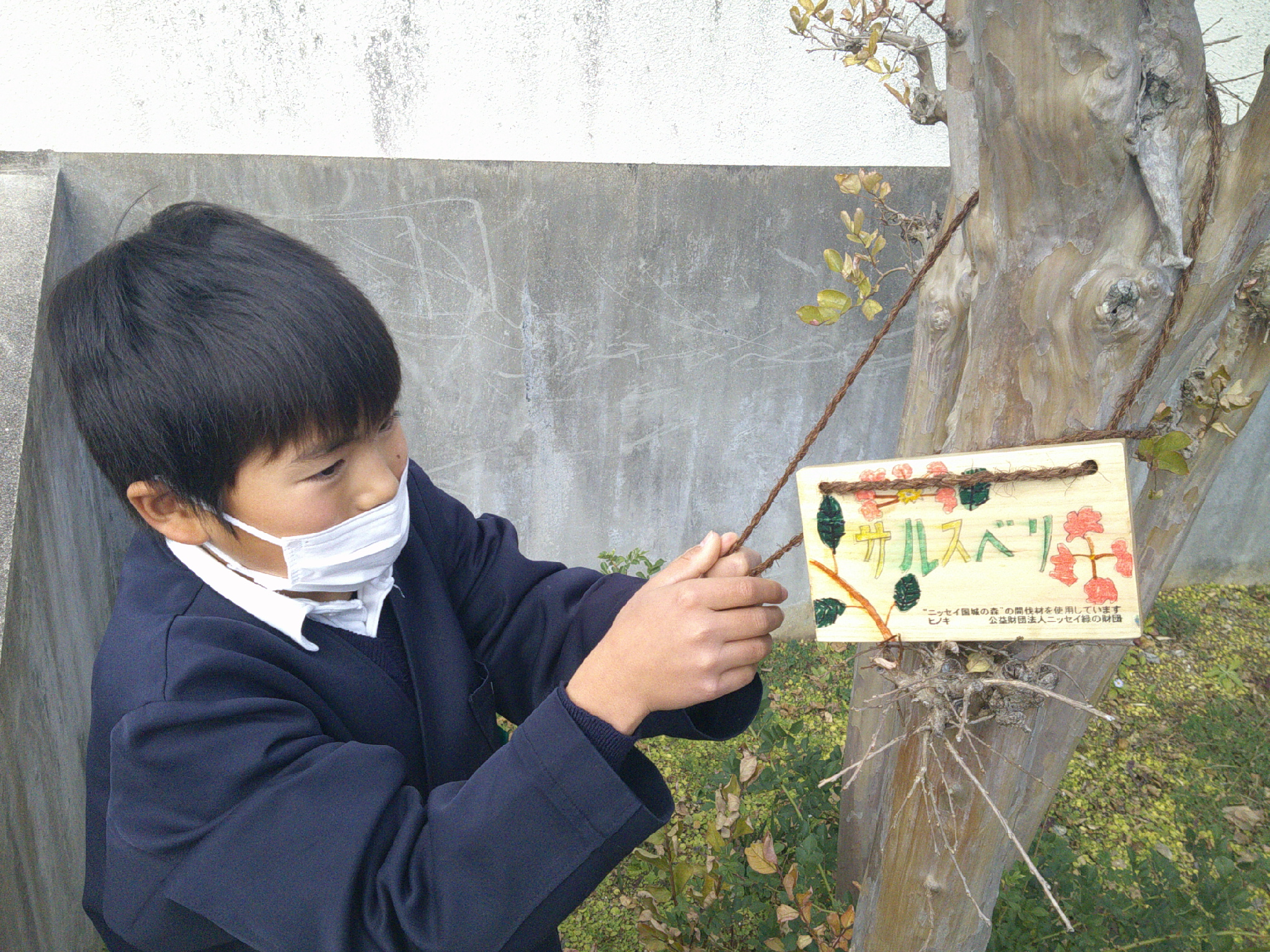 《和歌山県 有田川町立小川小学校にて、「学校の木のしおり」と樹木名プレート(樹名板)の作成・設置により校内の自然観察を行っていただきました》