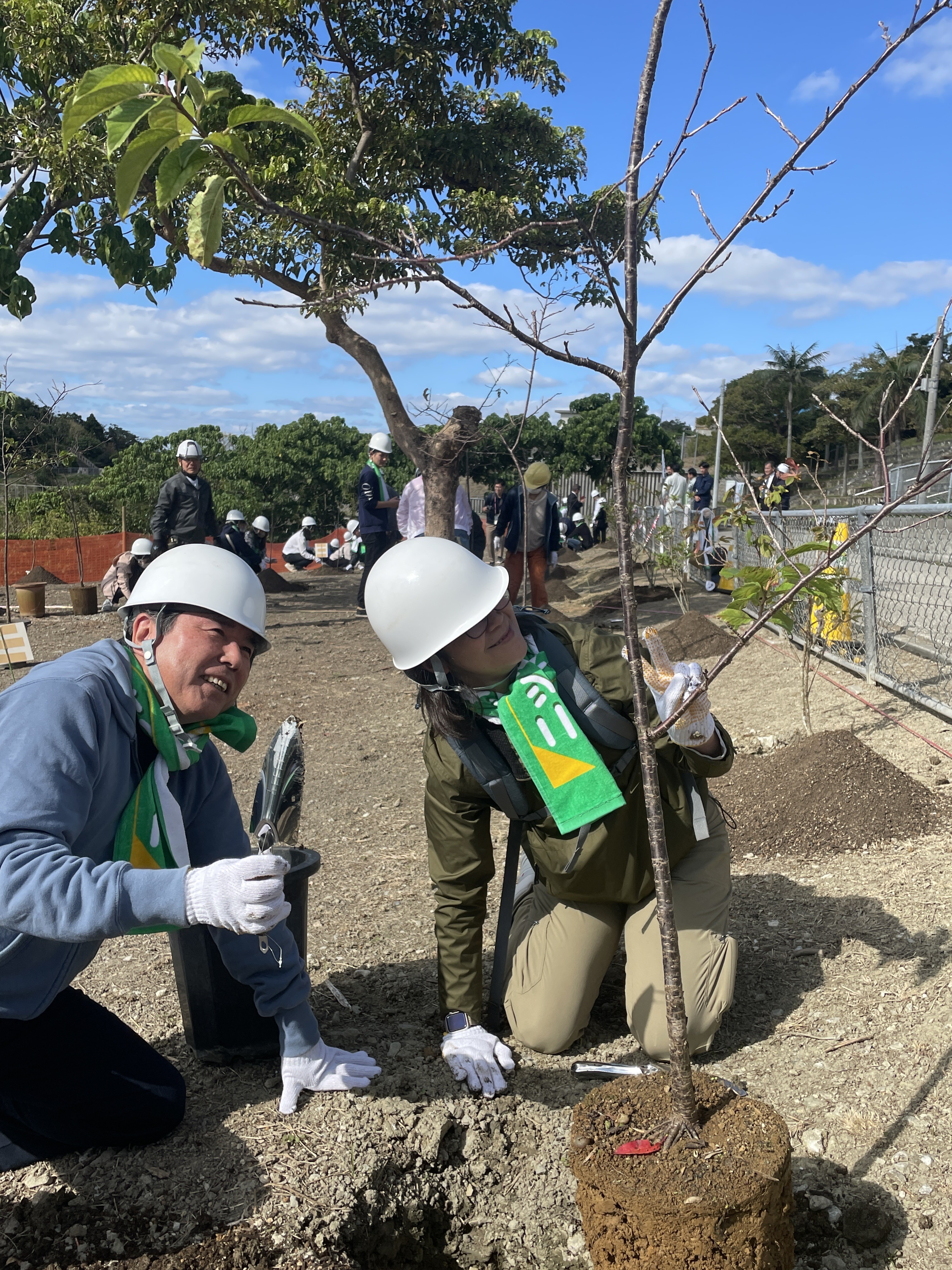 1月13日(土) "ニッセイ八重瀬の森" にて植樹ボランティアを開催しました。"ニッセイ八重瀬の森"は2023年に沖縄県と協定を締結した森で、八重瀬町西部プラザ公園内のハーブ体験工房付近、公園内の高台に位置しています。