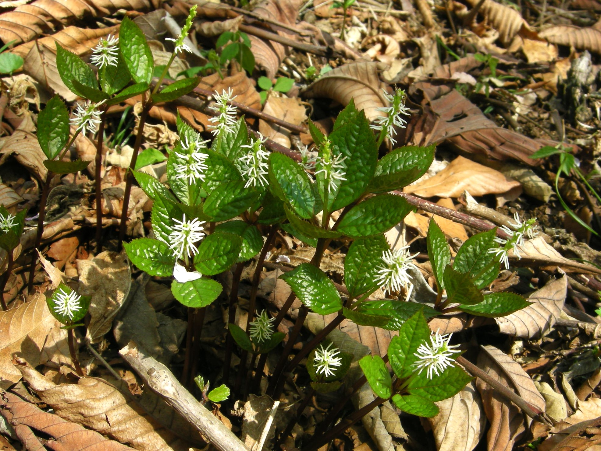 早春の雑木林の明るい林床で、光沢のある濃緑色の葉をかき分けるように白い花穂を伸ばします。