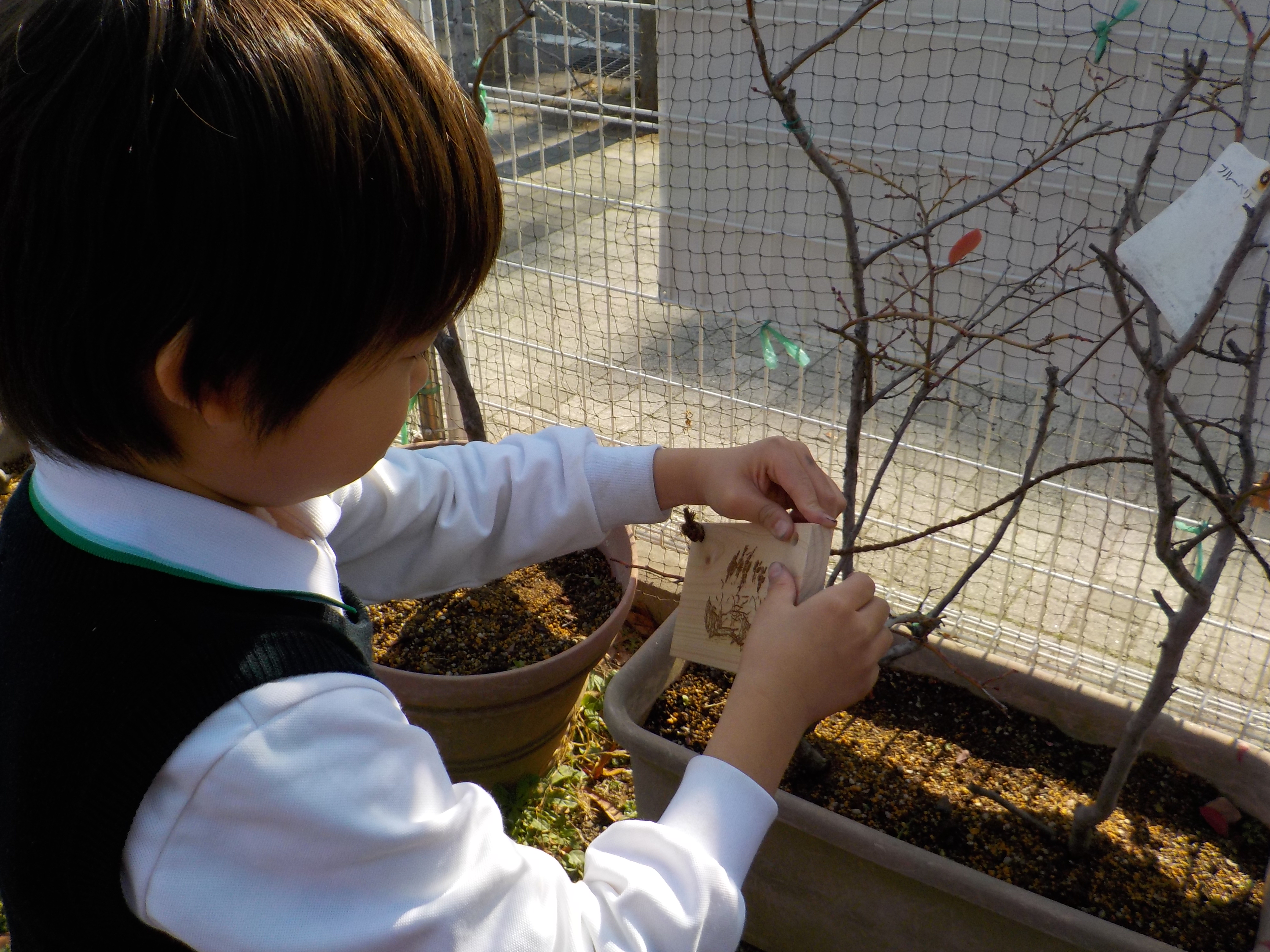 ・園庭には様々な樹木を植えていて、実のなる木(ぐみ、桑、柿、りんご、いちじく等)に実がなると園児たちが収穫し、食べる活動をしているので、お友達が描いたプレートを付けることで、より樹木に興味を持ち大切にして欲しいと思います。