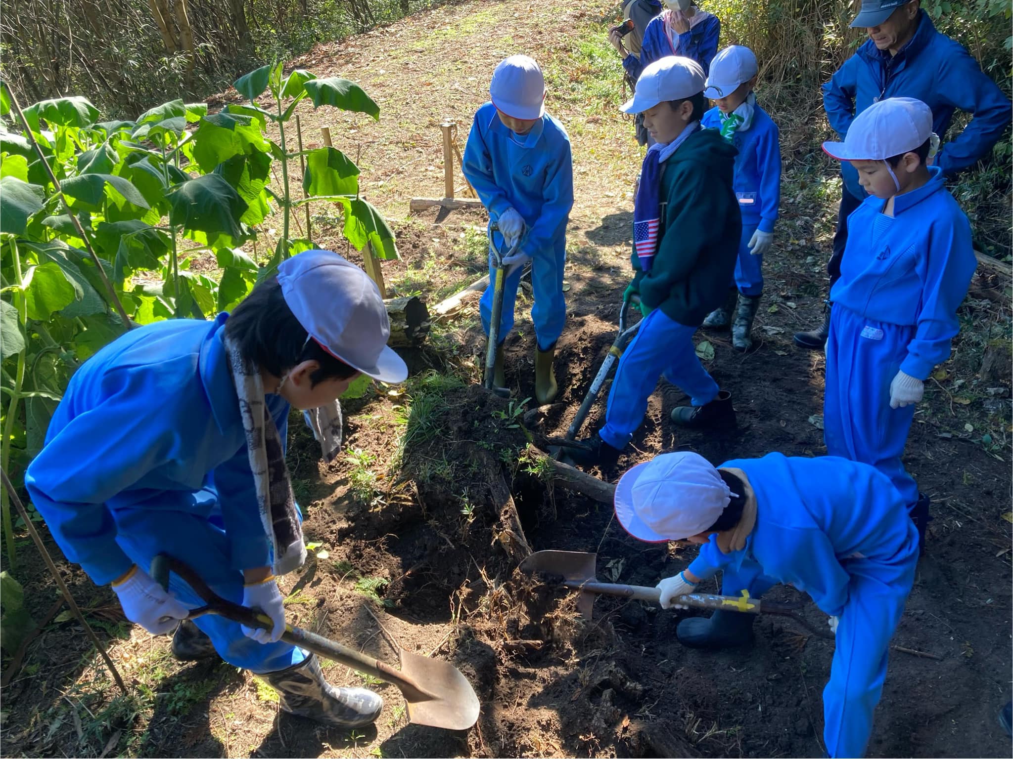 また、道中では葉っぱ遊びにも挑戦し、午前中活動の最後には児童全員で力を合わせてロープを引き、ヒノキの伐倒を体験。木が倒れると児童からは大きな歓声が上がっていました。