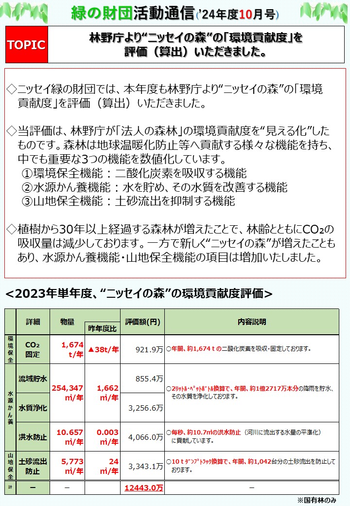 ニュース 《財団活動通信(10月号)の発行》 ニッセイ緑の財団の活動(森林づくり、イベント開催、学校の木のしおり・樹木名プレートの寄贈等)をまとめた「財団活動通信」を発行いたしました。 是非ご覧ください! 財団活動通信10月号 このページの先頭へ
