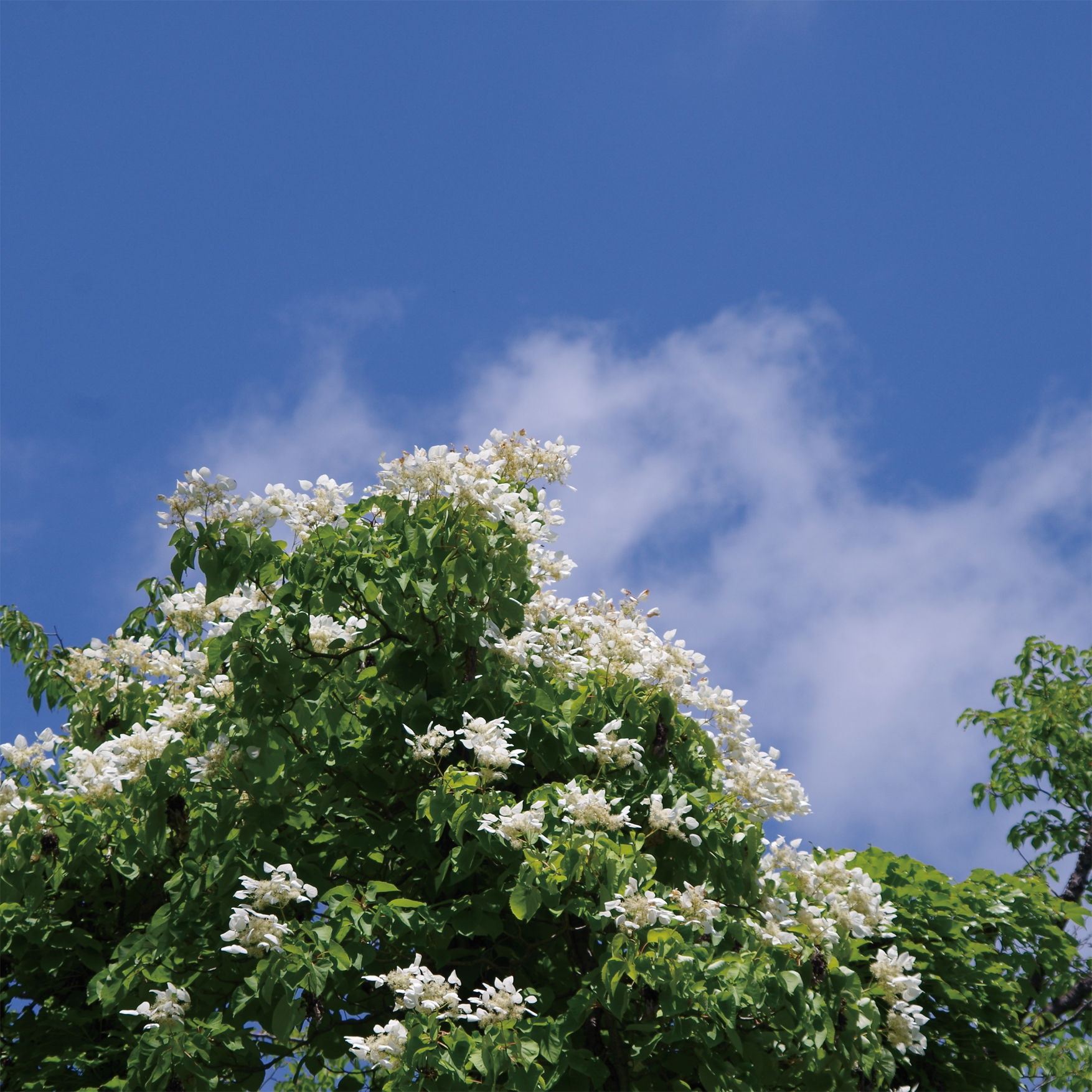 今の時期、葉を白く染めるマタタビ。白い色でムシたちに「花が咲いたよ~!」と合図を送っています。葉の裏側の方に、小さな花びらが5枚の白い花は夏梅ともよばれ、とても清楚でかわいらしく、良い香りがします。