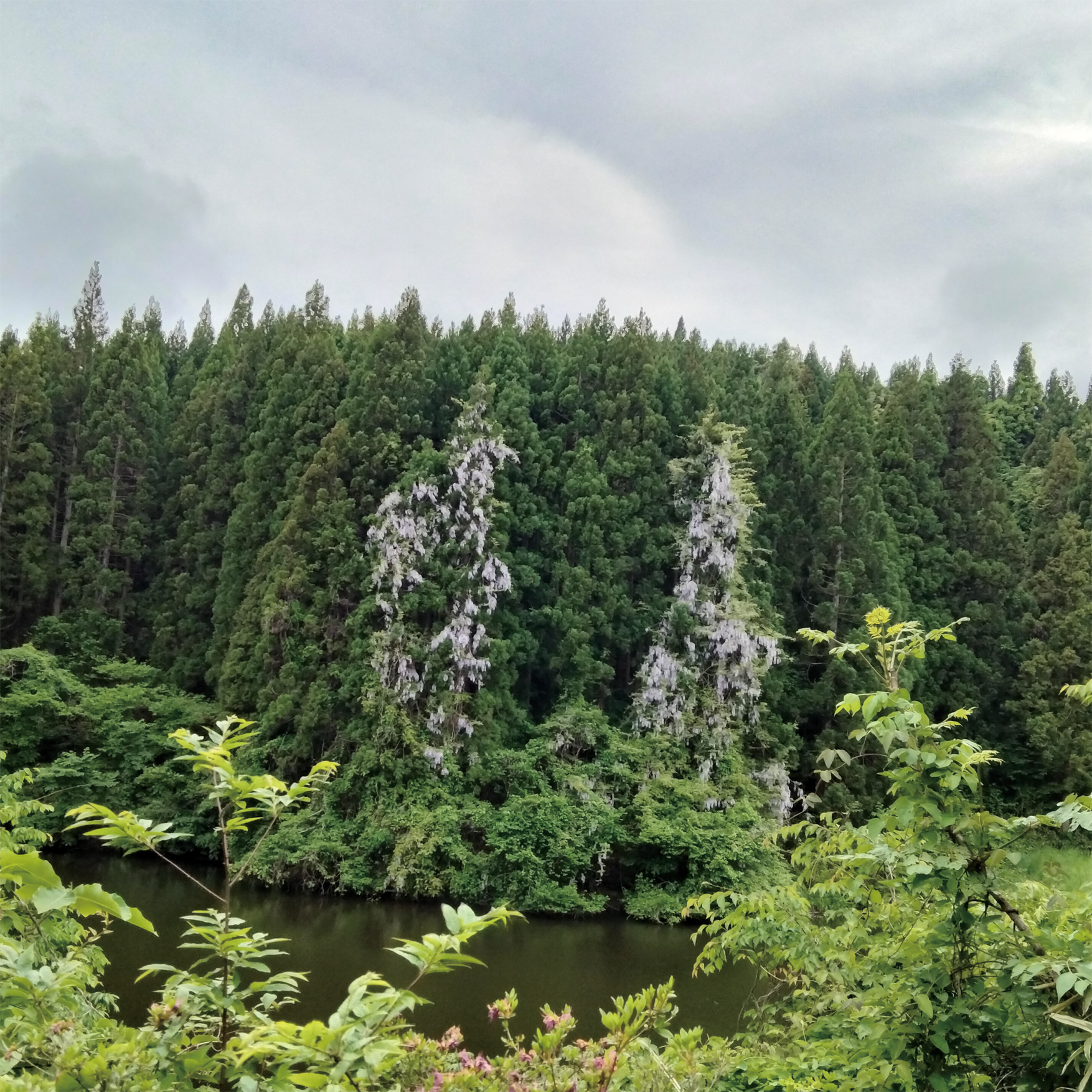 フジの花の時期には、森のあちらこちらに紫色の滝が出現します。人の手で藤棚にきれいにまとめられたフジとは違って、野性味を帯びた迫力のある眺めです。