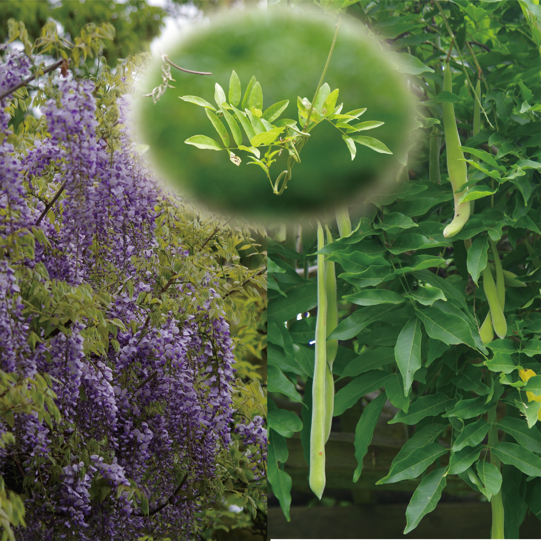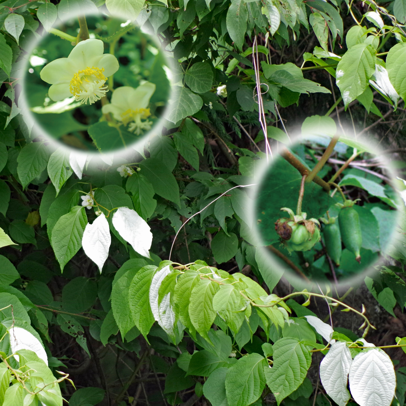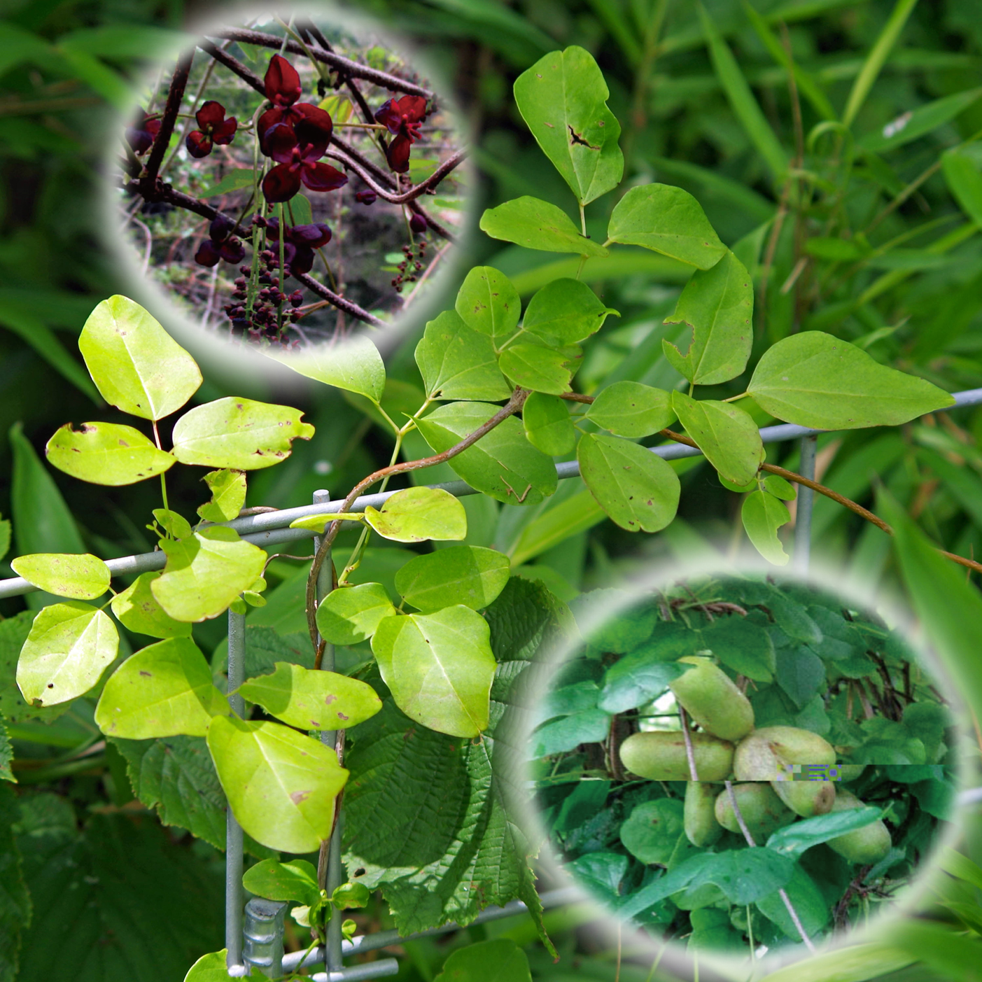 秋の味覚のアケビの仲間。葉っぱが3枚なのでミツバアケビと呼ばれます。花は春、今は小さな実が生っている頃です。秋に赤紫になった実は、果皮が割れて、中からゼリー状の果肉が見えます。果肉は半透明で中に黒い種がたくさんあり、甘くておいしいです。皮は天ぷらにしたり、肉詰めにしたりしてほろ苦さを楽しみます。ツルは弾力があり、丈夫でしなやか。かごなどの民芸品になります。