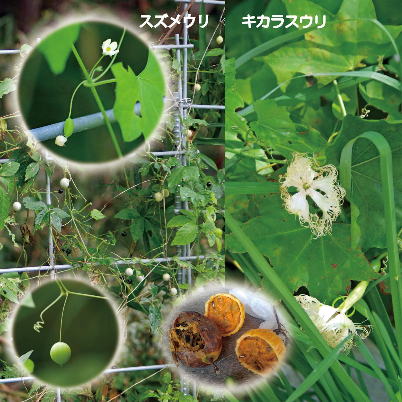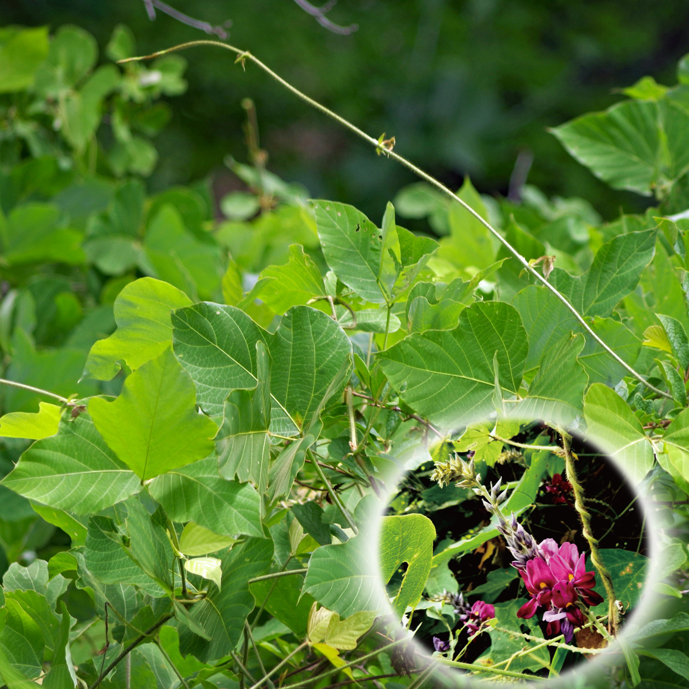 暑い夏、ツル植物たちは、ここぞとばかりに繁茂しています。あらゆるものに絡みつくため、駆除がしにくく、刈払い作業の敵となっています。その一方で、エネルギッシュな生命力には驚かされるばかりです。