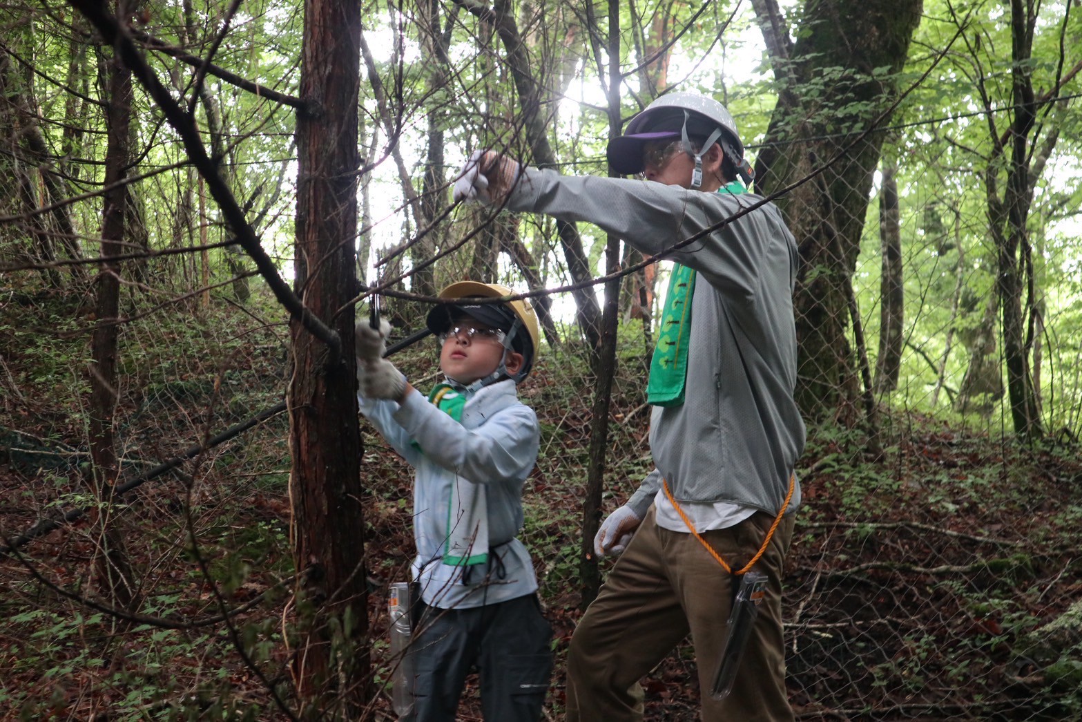 日本生命朝日社長をはじめとしたニッセイの森友の会各位、三機工業様からのご参加者を含め、総勢122名のご参加を頂き、ヒノキの枝打のほかに、鹿による樹皮被害を防止する作業を行いました。