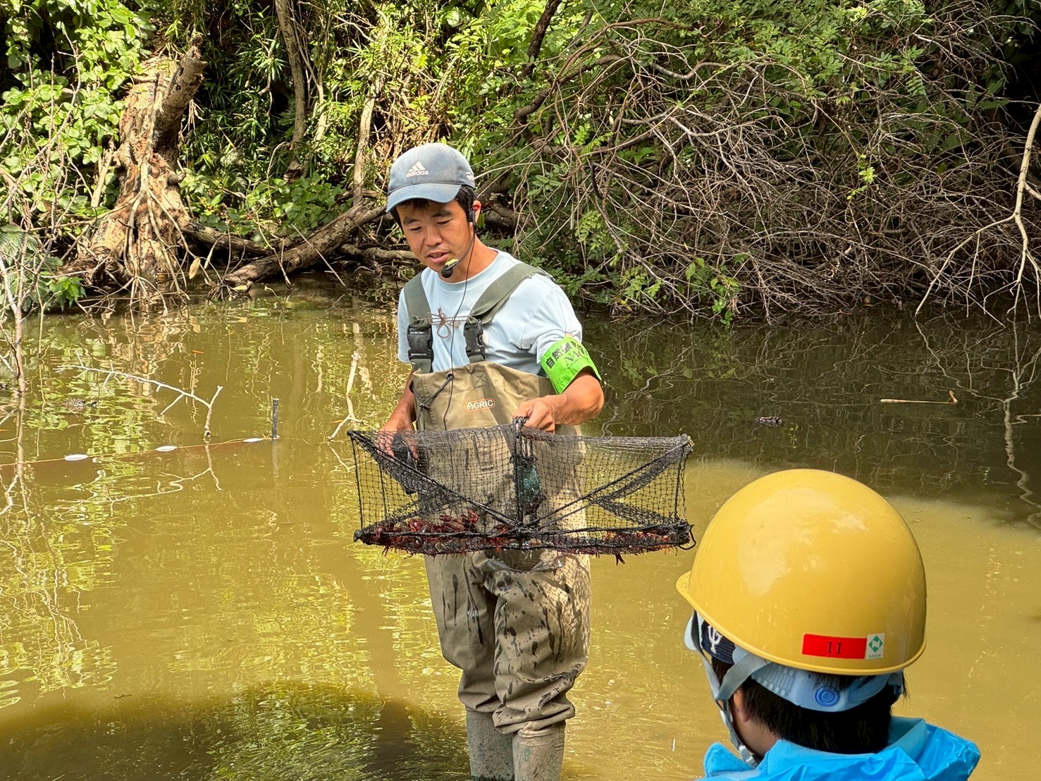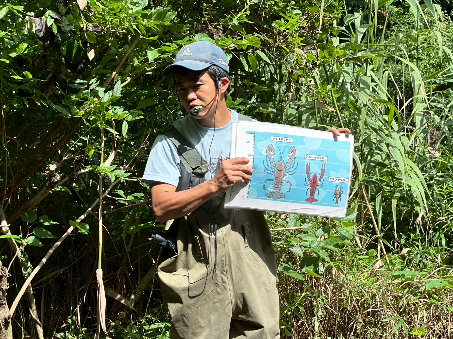 今回参加いただいた親子の皆さんには、午前中は特定外来生物であるアメリカザリガニの捕獲と水生動物の観察、午後は外来植物等の除去を行っていただきました。それぞれの作業の前には、外来動植物による生態系への影響についての学習も行いましたが、皆さん真剣に話を聞いておられました。