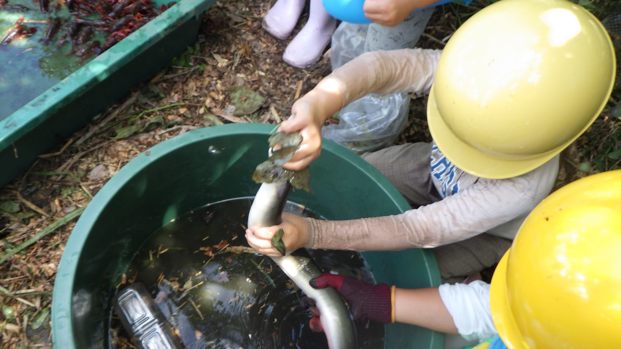 ザリガニ捕獲では、ザリガニのオスメスの見分け方を教えてもらい、自分たちで当てっこしたり、罠にかかったニホンウナギ!を手づかみしてみたり、子どもも大人も楽しんでいただきました。