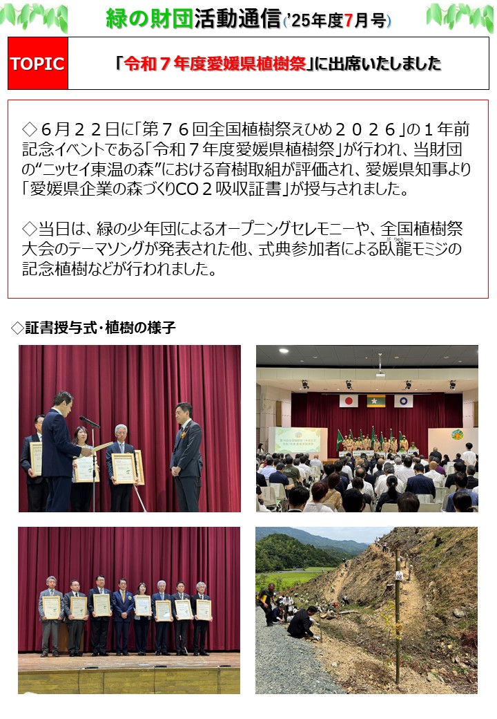 ニュース 《財団活動通信(7月号)の発行》 ニッセイ緑の財団の活動(森林づくり、イベント開催、学校の木のしおり・樹木名プレートの寄贈等)をまとめた「財団活動通信」を発行いたしました。 是非、ご覧ください! 財団活動通信7月号 このページの先頭へ