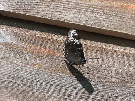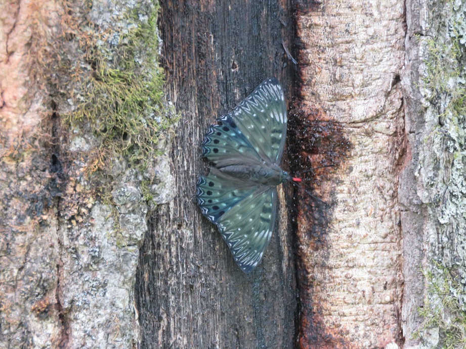 「スミナガシ」とは本当にその通りで、。翅の縁のくの字の模様が墨を流したような、全体的には黒っぽい模様をしていますが、光の当たり方によっては青緑色や青色を帯びた感じにも見えます。