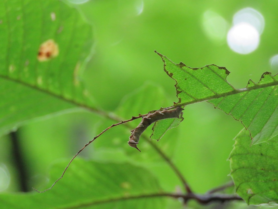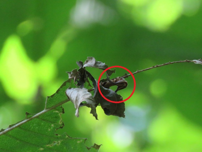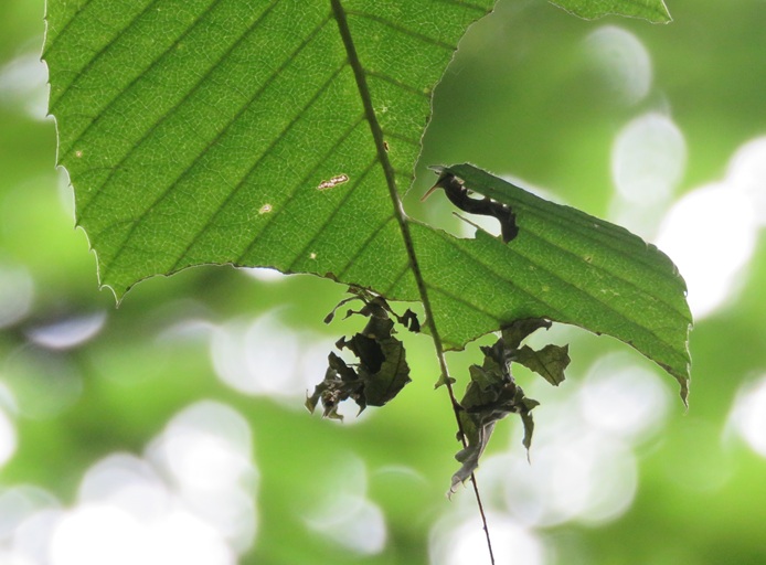 写真の中の幼虫わかりますか?幼虫はアワブキの葉っぱを食べます。野鳥の森にはアワブキがたくさんあります。スミナガシの食痕の特徴は食べ残した葉っぱをカーテンのようにぶら下げていることです。これを見つけるとスミナガシ幼虫が見つかるかもしれません。