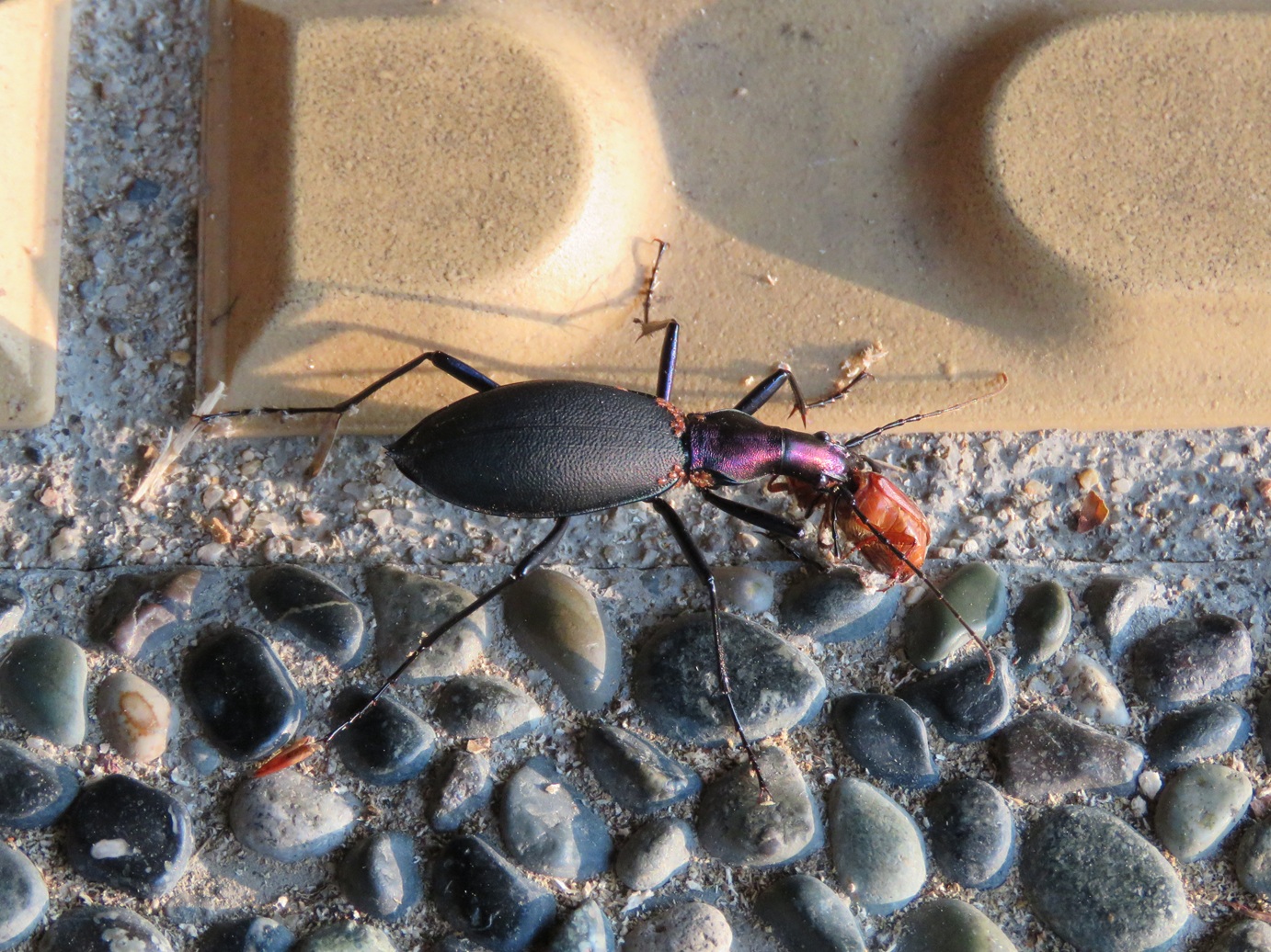 胸から前翅あたりにダニがついていますが、甲虫の蛹のようなものを運んでいました。