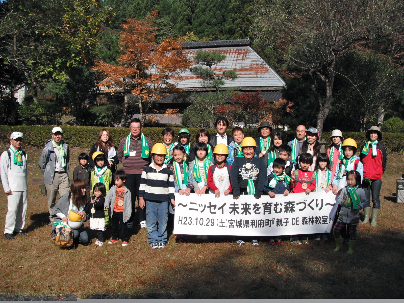 10月29日(土)好天の下、塩竈市、山元町で被災された親子の方々を招待してニッセイ利府の森で森林教室を開催しました。午前中は植樹、枝払い等の森づくり体験、更にはノコギリを使っての巣箱づくりに汗を流し、お昼は美味しい芋煮に舌鼓、午後は森と遊ぶをテーマに、森の不思議にチャレンジするビンゴとこんなものまで作れるのという木工教室に挑戦。あっという間の一日でした。宮城県森林インストラクター協会、NPO法人地球の楽好他の協力を得て、参加者からはまた来たいとの声が相次ぐ催しとなりました。