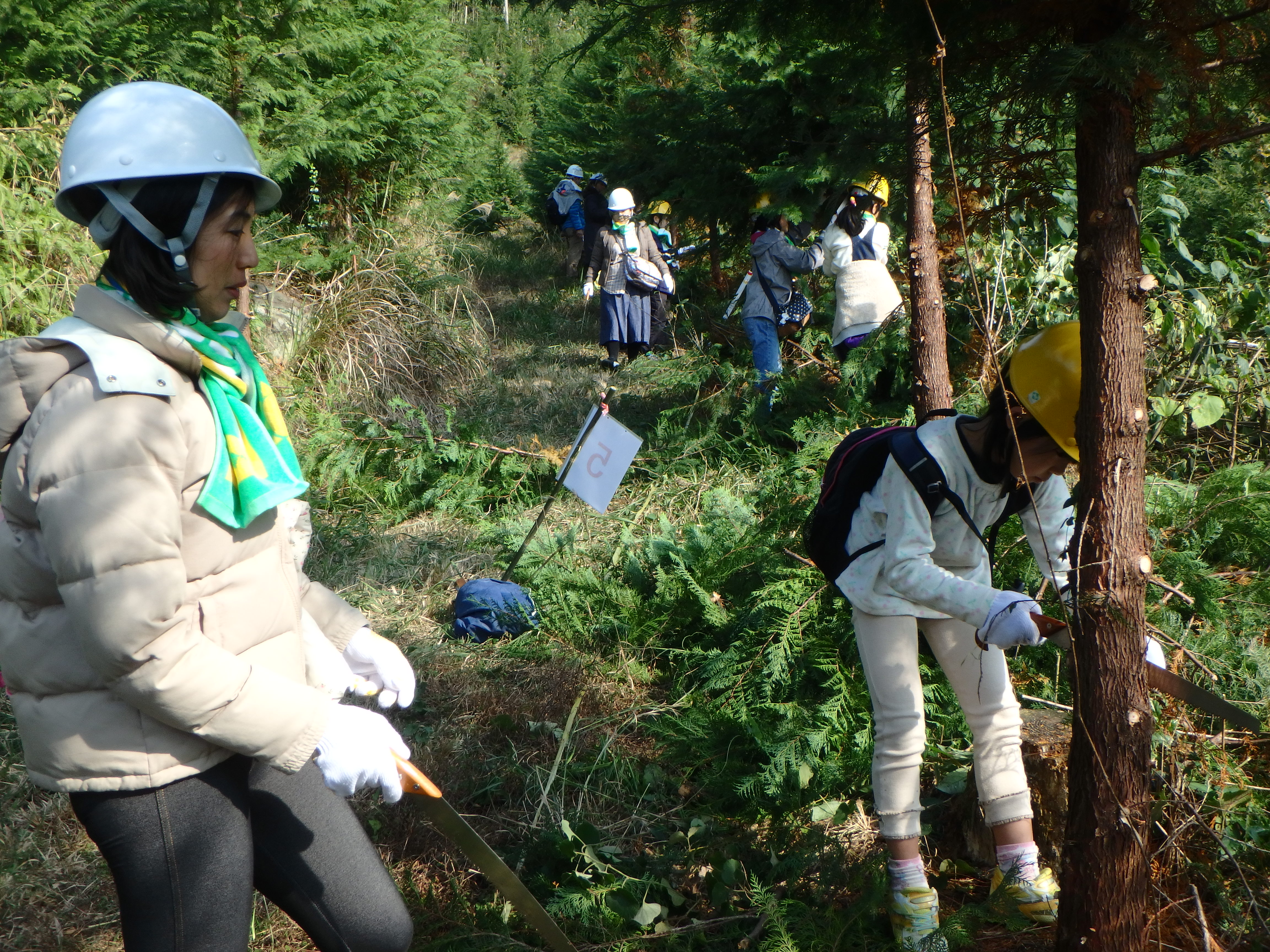 当初、雨が心配されましたが、無事に開催することができました。参加した皆さんは、一生懸命、ノコギリで植栽したヒノキの枝を伐りっていただきました。活動前は、暗くなっていた森も、皆さんの頑張りで、光が差し込み、見違えるように明るい森となりました。木々は、これから、さらに元気よく育っていくと思います。
