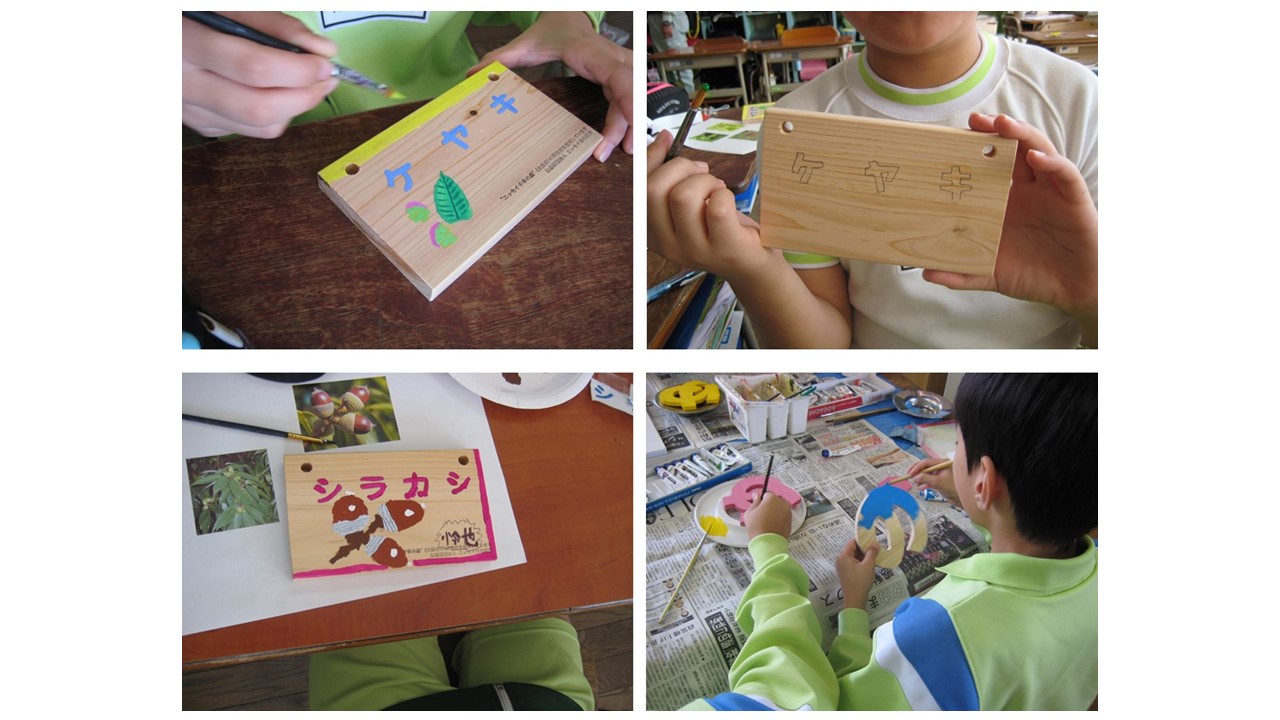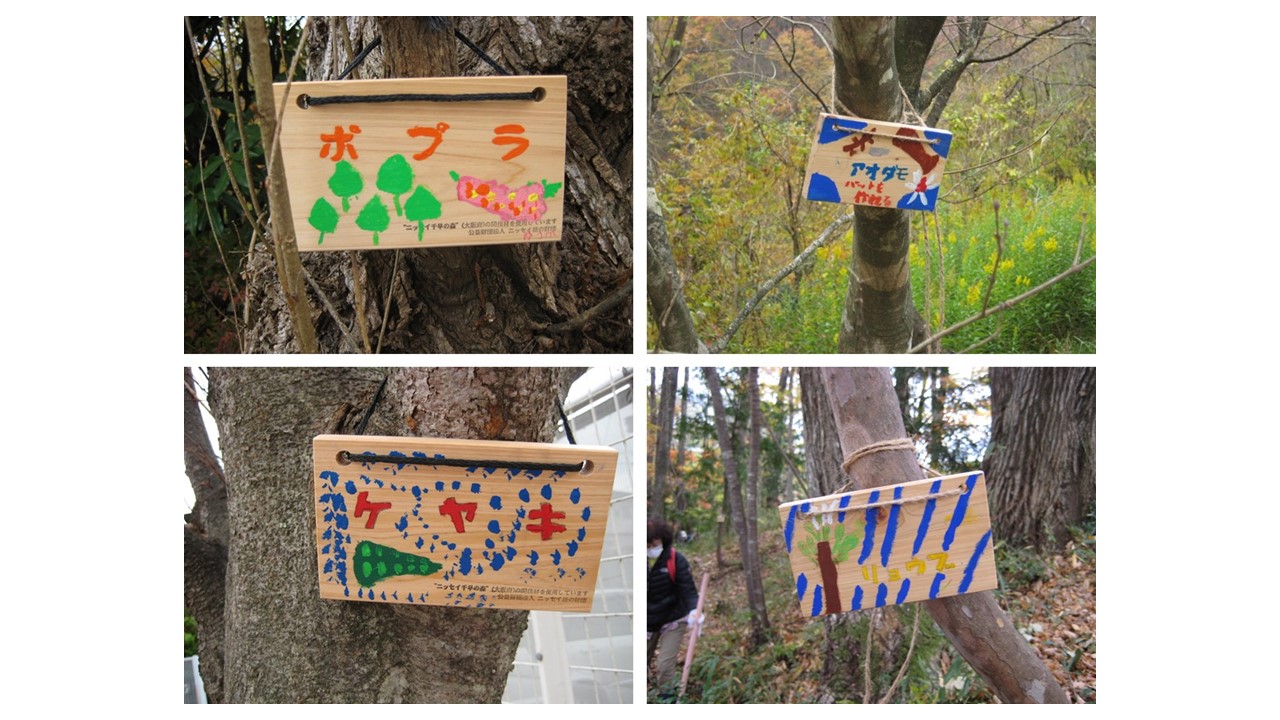 校庭や森の中を歩きながら取り付ける木を決めて、図鑑や写真を見ながら木の名前とイラストや解説を書き、普段から見ている木々を改めて知ることができる良いきっかけとなりました。