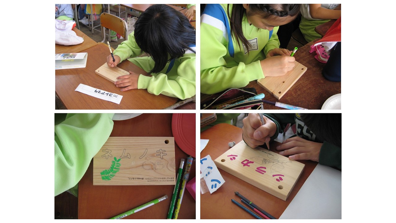 樹木名プレート(”ニッセイの森”間伐材を加工)の寄贈活動ですが、11月14日(火)に宮城県 富谷市立日吉台小学校の5年生92名の方に設置の作業を行っていただきました!