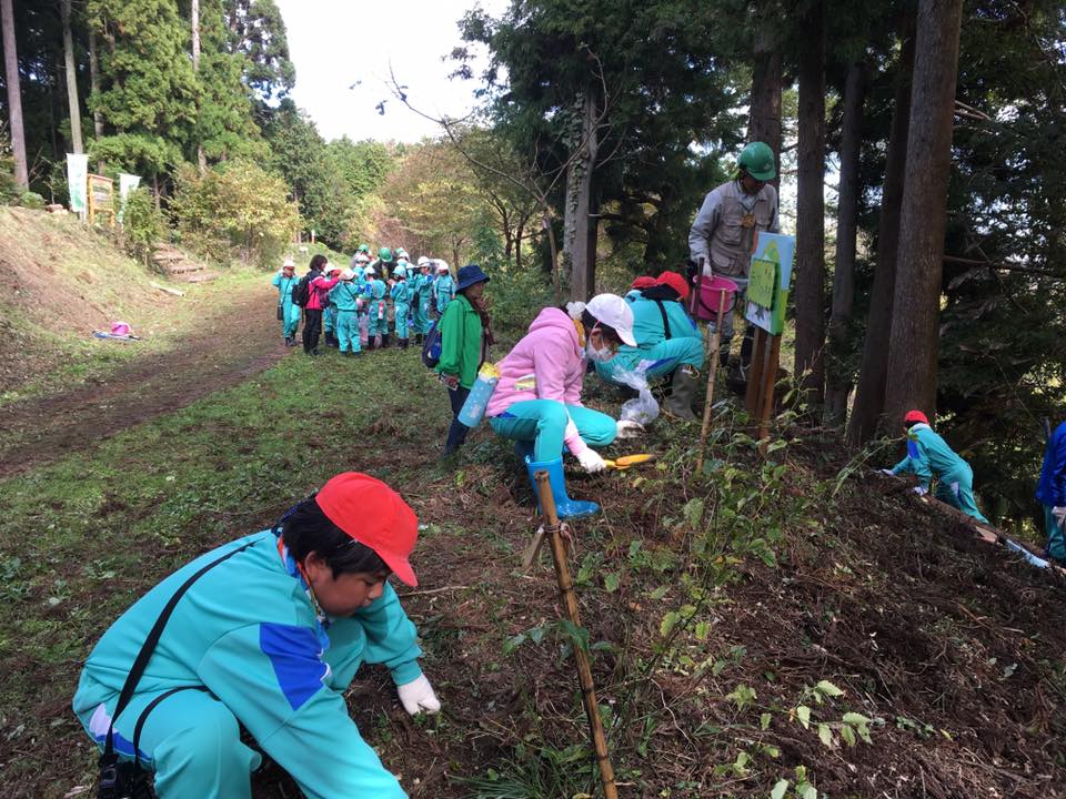 事前に学校で宮城県森林インストラクター協会の指導のもと、森づくり道具の使い方を学んでおり、今回はその成果を発揮する場でもあり、森づくり活動はベンチ設置や植樹・施肥、遊歩道づくり、枝打ち除伐など多岐に渡る活動を行いました。