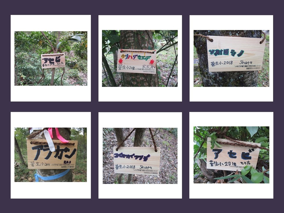 自然体験学習で10月に来校した兵庫県の公立小学校5年生200名の方に、樹木名プレート設置にご協力をいただきました。