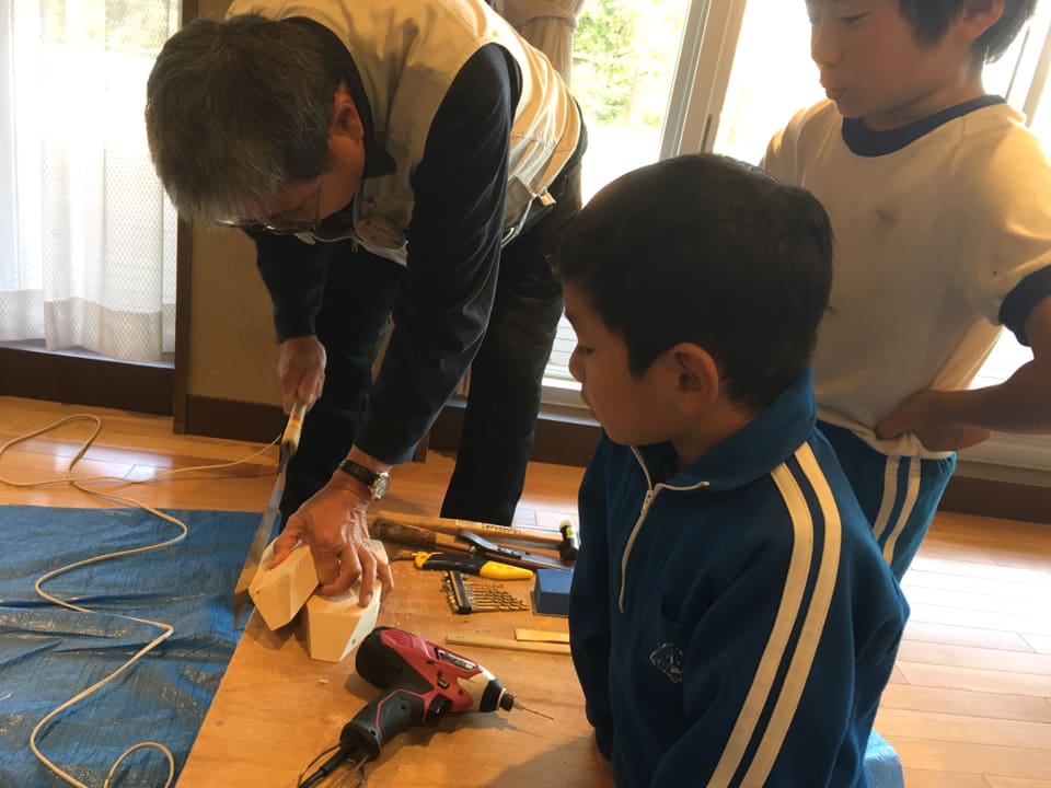 また今回の活動には、「県民の森」と「宮城県森林インストラクター協会」にキャリアシップ実習として訪れていた利府町内の中学生6名も参加し、児童たちのクラフト活動をサポートしました。