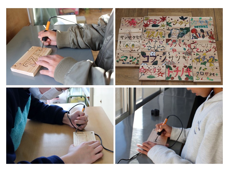 委員会活動で校内の樹木名を調べ、電熱ペン(ウッドバーニング)を使用して樹木名を刻み、周りをマジックで装飾し完成させました。児童たちが意欲的にアイデアを出し合って設置活動ができましたとの感想をいただきました。