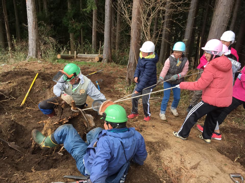宮城県森林インストラクター協会の方の指導のもと、午前中は高枝の除伐や遊歩道整備、切り株の抜根作業を行い、午後はエステバンとのレクリエーションやネイチャークラフト活動を行いました。