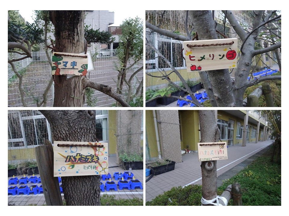 委員会活動の時間にプレートの作成と設置をしました。樹種の選択からプレートのデザインまで児童たちが進んで取組み、樹木の名前を知る良いきっかけになりましたとの感想をいただきました。