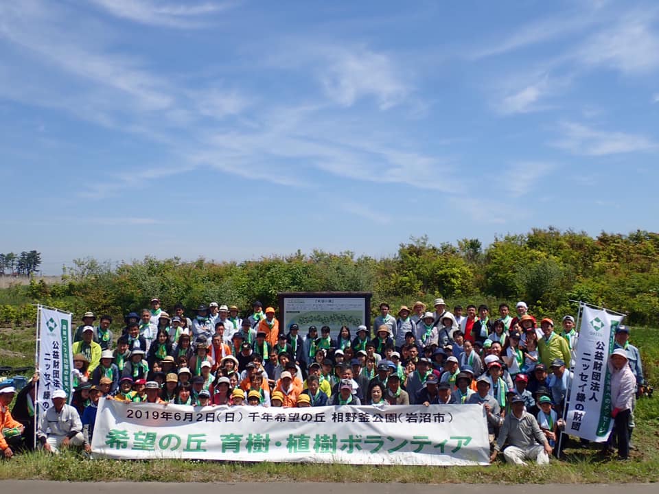 本日6月2日(日)来年6月にオリンピックの聖火リレーのルートの1つに決まりました宮城県岩沼市千年希望の丘にて、育樹・植樹ボランティアを地域住民の方や岩沼市役所の方、中央大学の学生の方、植樹した苗木を育てていただいている鳥取県/宮城県の小学生、運営主体であるニッセイの森友の会(仙台支社)を中心に総勢150名の方々と実施致しました。
