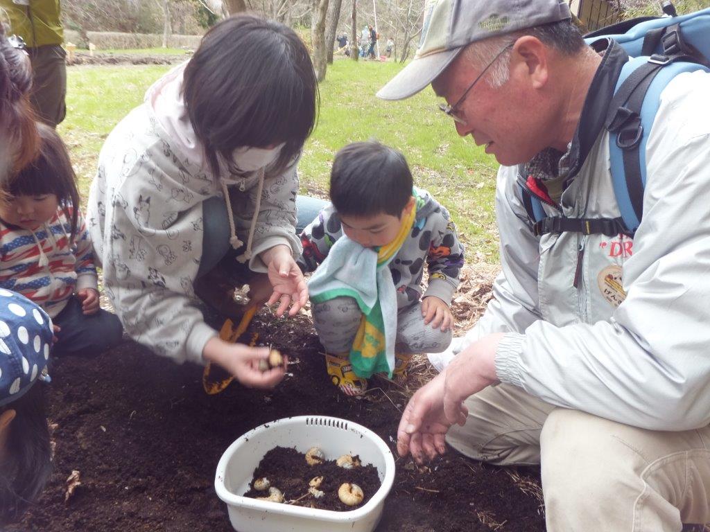 写真は自然観察ゲームの中の幼虫探し。積極的に触る子もいれば、怖がる子もいたり、いろんな反応が楽しめました。