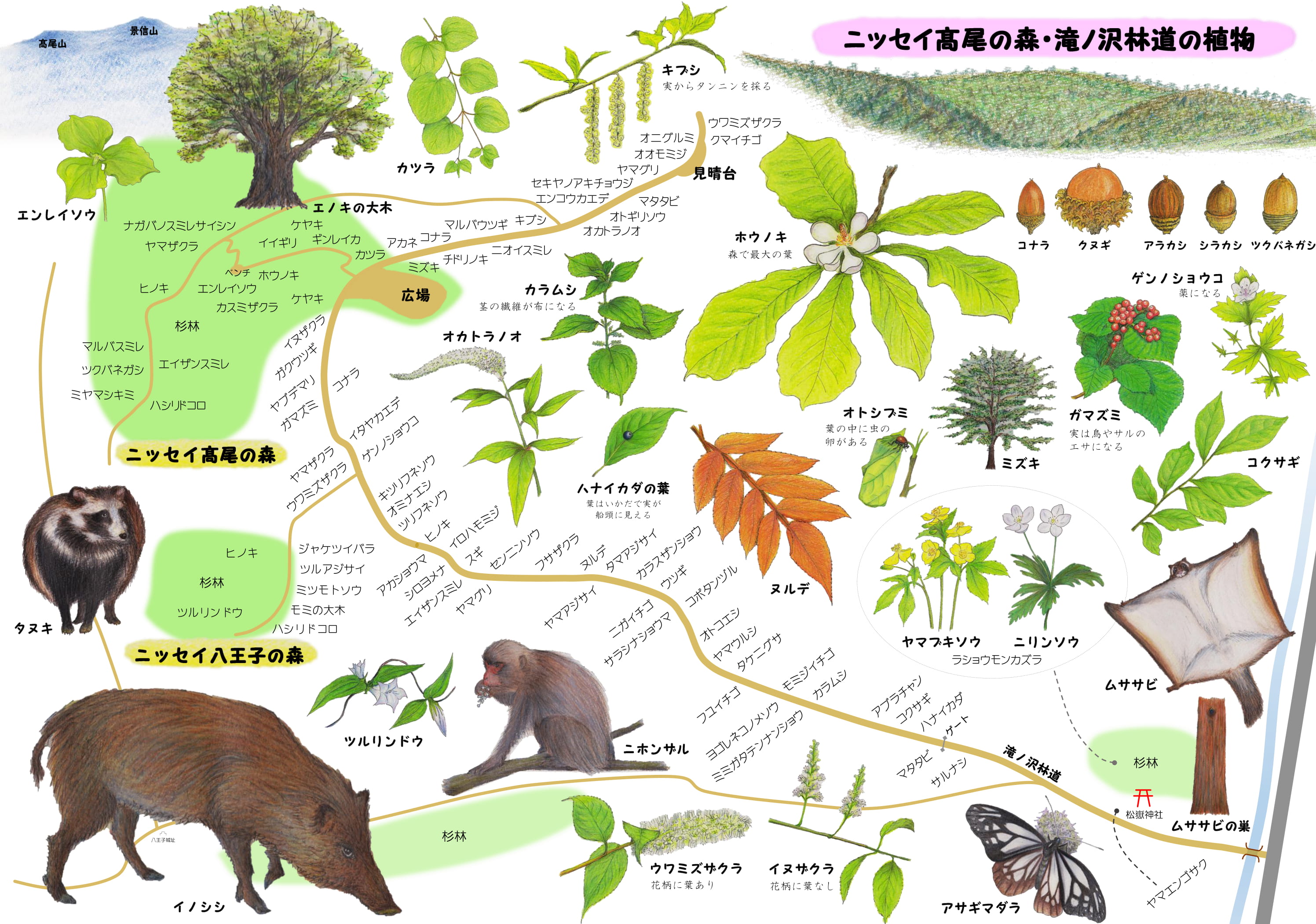 “ニッセイ高尾の森”は高尾山(東京都八王子市)の北隣にある森で、恩方地域から伸びる滝ノ沢林道を30分ほど登った場所にあります。日本の中央にあるので、北海道や東北などの寒い場所で見られる植物と九州などからの暖かい場所で見られる植物の両方の植物が見られます。そんな環境ですから、“ニッセイ高尾の森”やその脇の滝ノ沢林道沿いを歩けば、四季を通じて400種近くの植物が手軽に観察できます。また、植物観察会参加者の方々が300本以上の植物名プレートを作ってくれたので、植物名を学習するよい場所になっています。