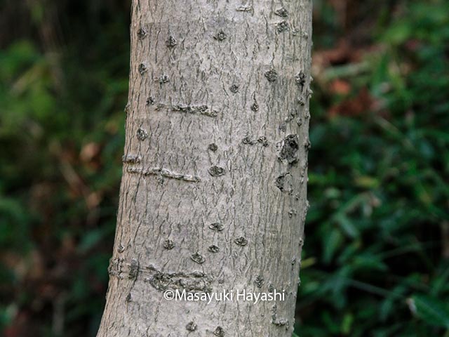 4:キンモクセイの樹皮。ひし形の模様がある。樹皮がサイ(犀)の肌に似ていることが木犀(モクセイ)の名の由来。